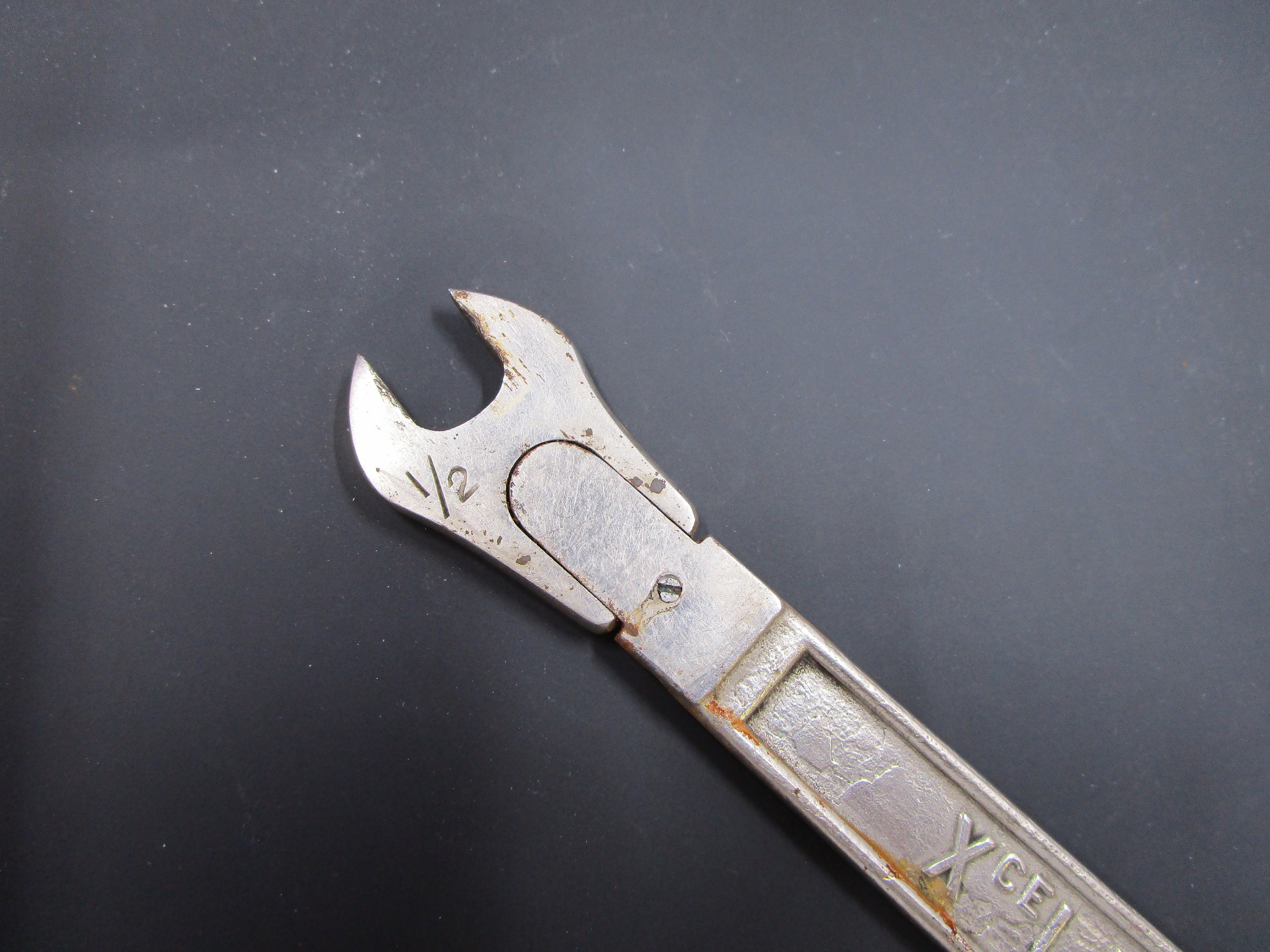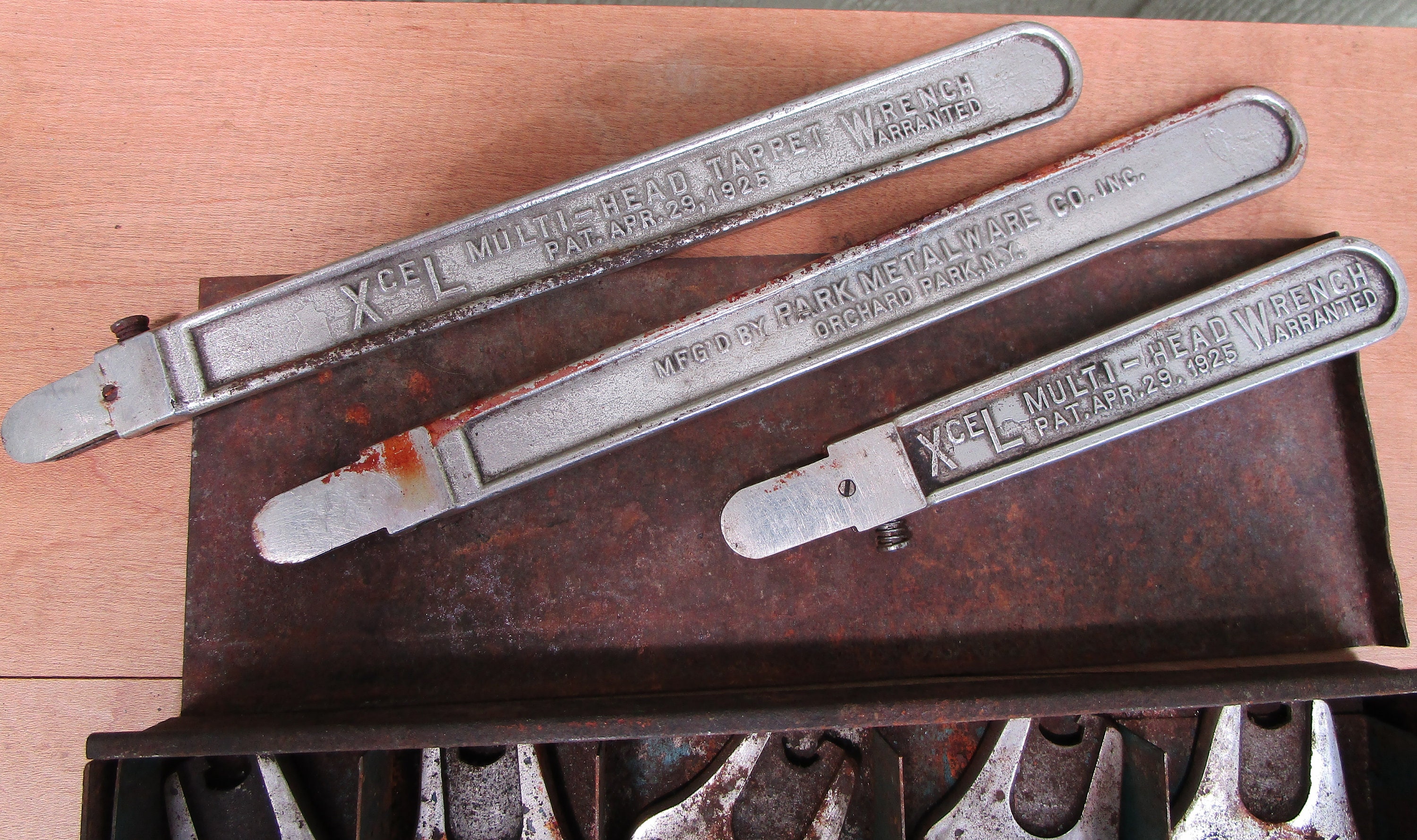 Listing is for a unique patented wrench set design, featuring different sized open end wrench heads and three handles to fit each wrench head. The set is made by PARK METALWARE CO. INC. ORCHARD PARK N.Y. XCEL MULTI-HEAD WRENCH WARRANTED PAT. APR.29.1925.