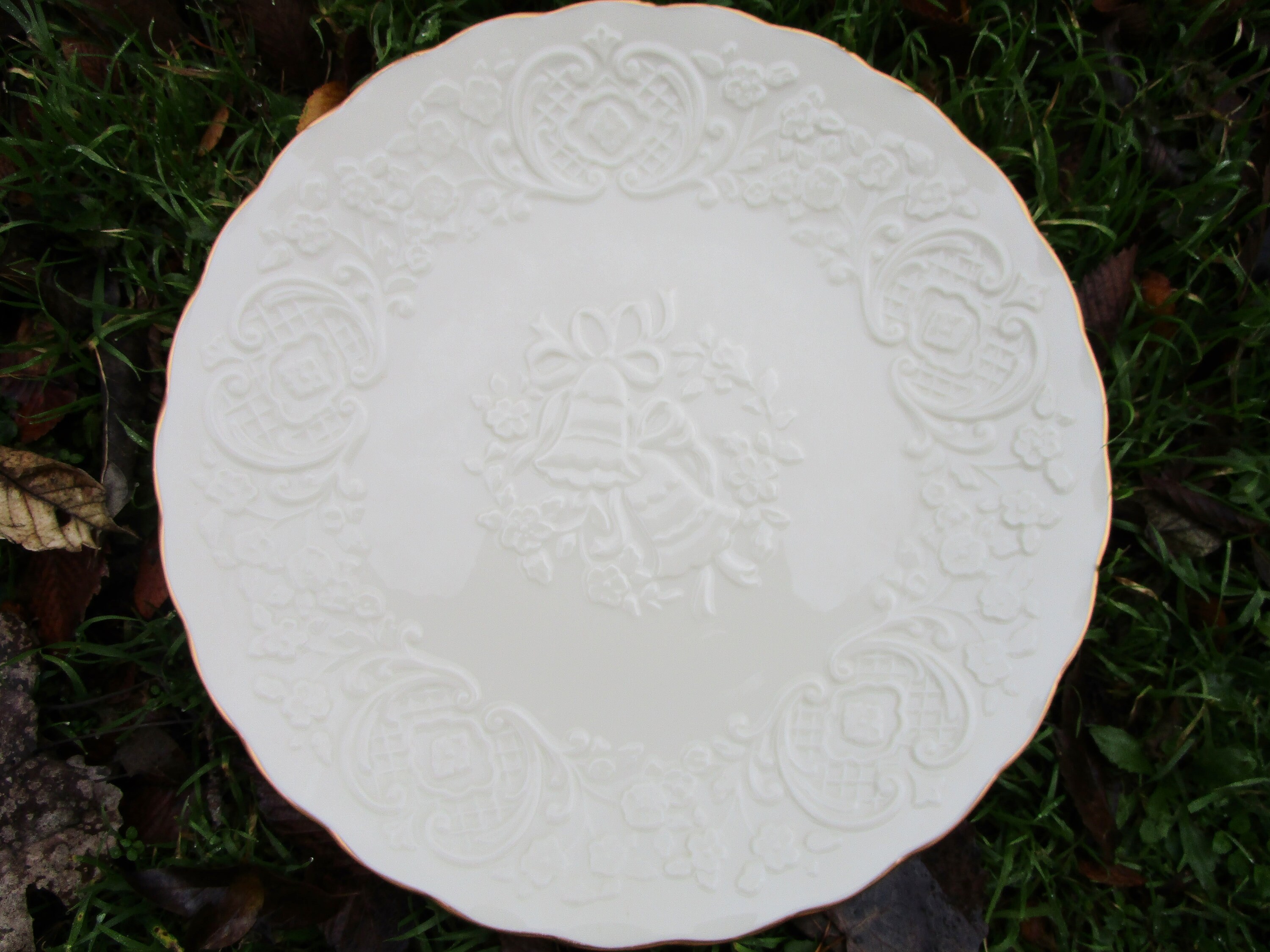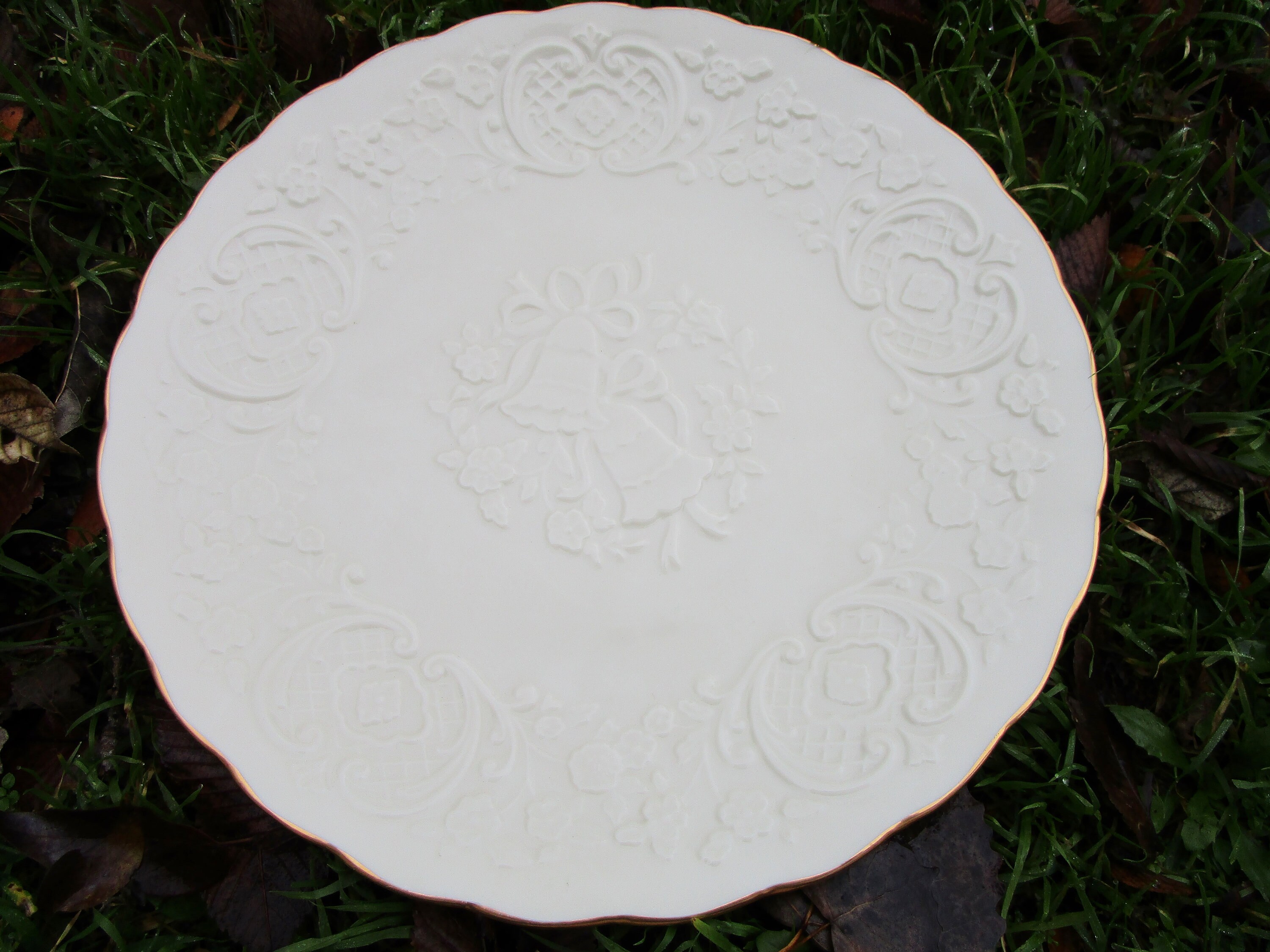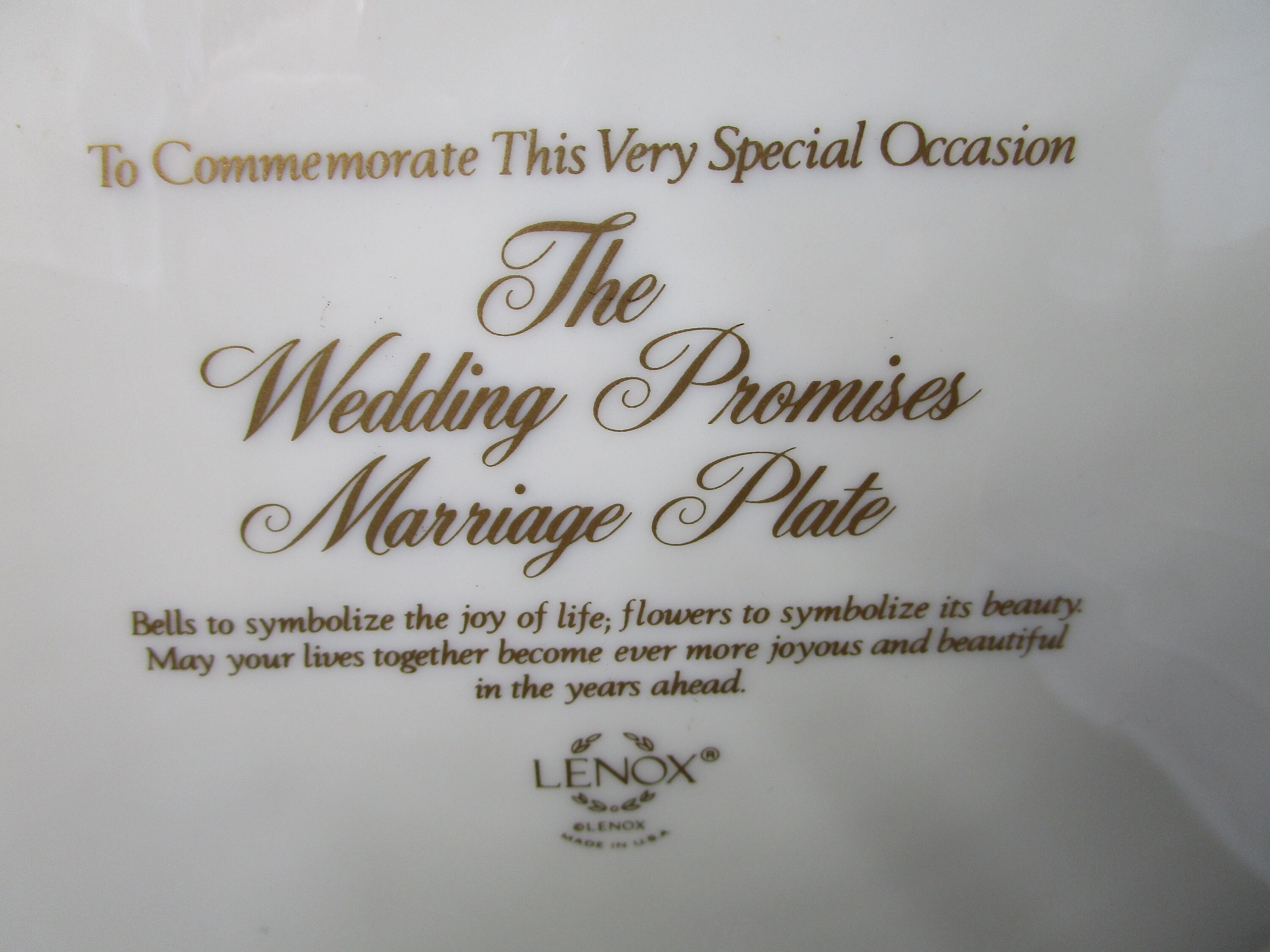 Item: Listing is for a 12 1/2" plate from Lenox, in the Wedding Promises collection. Platter is made in Lenox's signature ivory-cream colored porcelain, with gold trim. The decorative relief pattern features wedding bells in the center, border of filigree design, incorporating apple blossoms. The item is in good vintage condition -- no cracks, dings, repairs, scratches.
