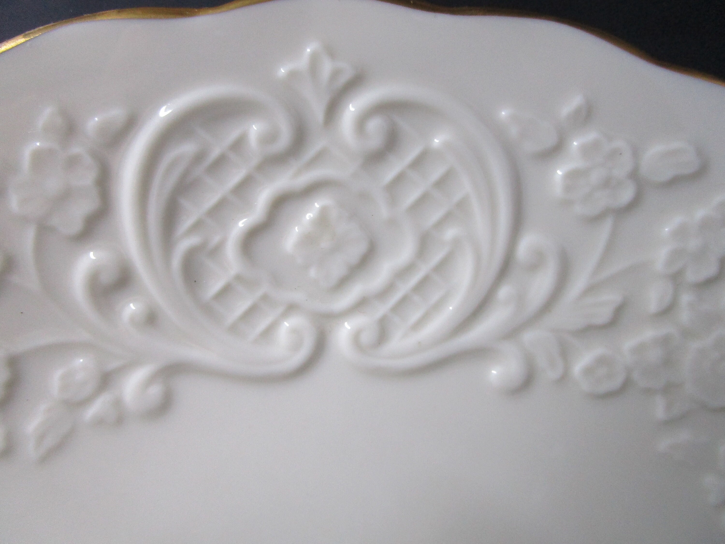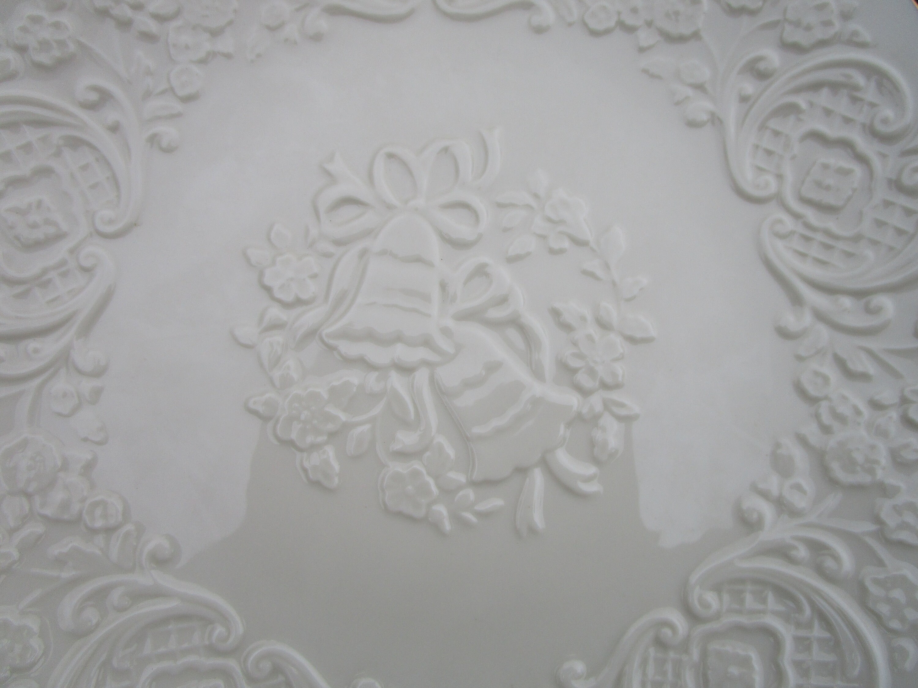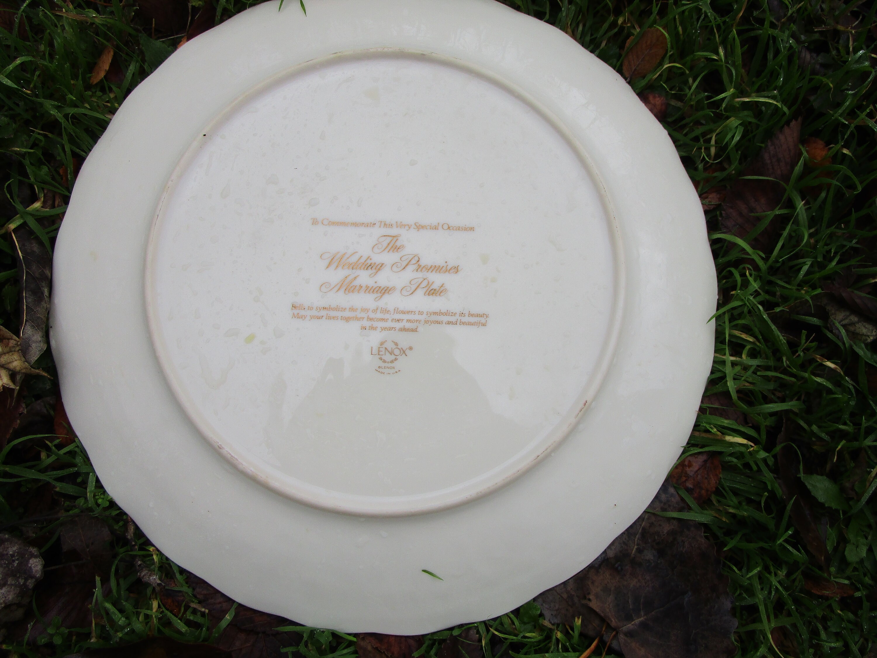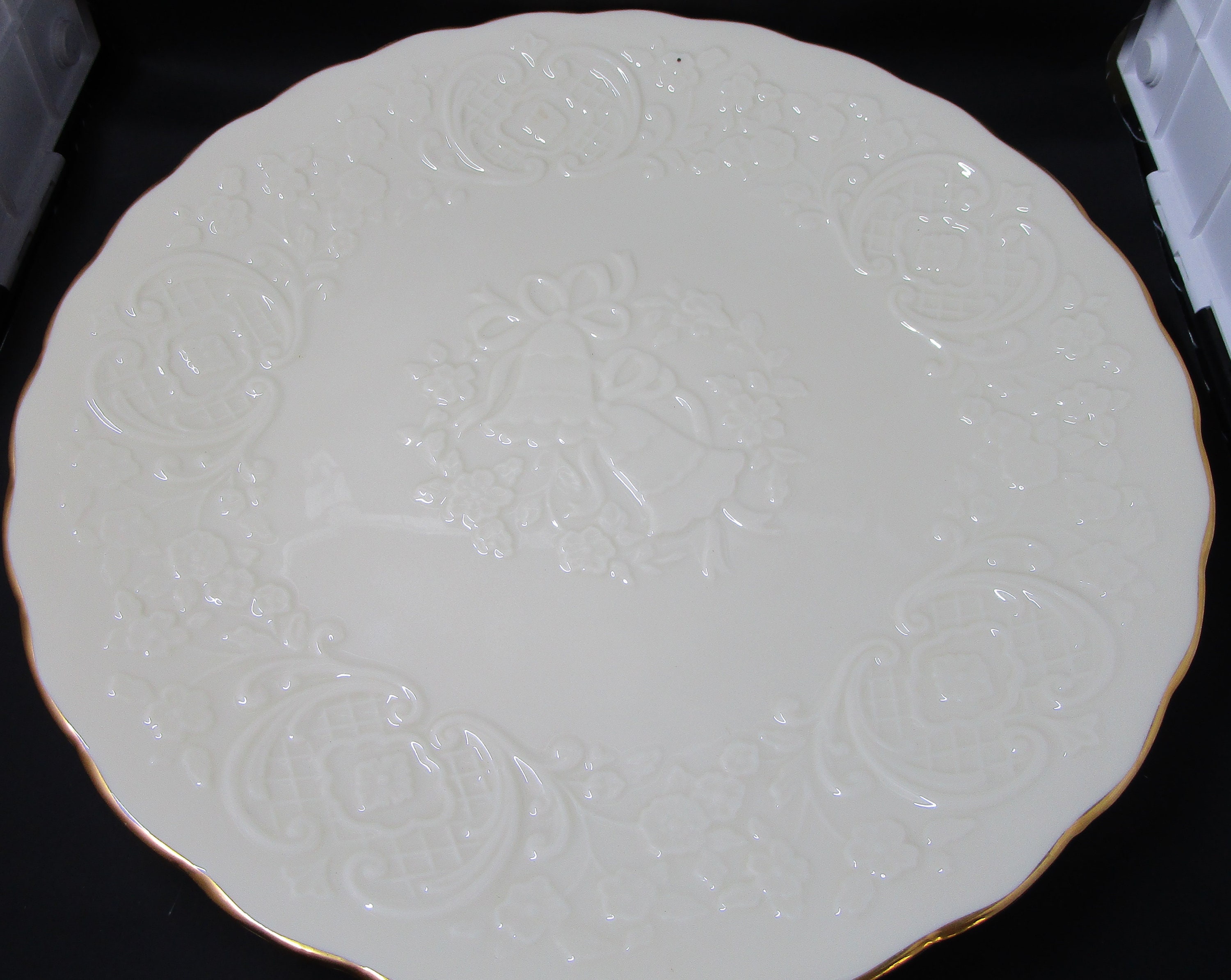 Item: Listing is for a 12 1/2" plate from Lenox, in the Wedding Promises collection. Platter is made in Lenox's signature ivory-cream colored porcelain, with gold trim. The decorative relief pattern features wedding bells in the center, border of filigree design, incorporating apple blossoms. The item is in good vintage condition -- no cracks, dings, repairs, scratches.