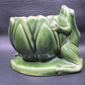 Two colorful parrots, resting on a tree trunk, enjoying a snack of grapes, adds color and whimsey to this majolica bud vase. Measures 4 1/2" tall, 3 3/4" wide, 2 1/2" deep Vase portion measures 4 1/2" tall, 1 1/2" diameter. No marks to show origin.