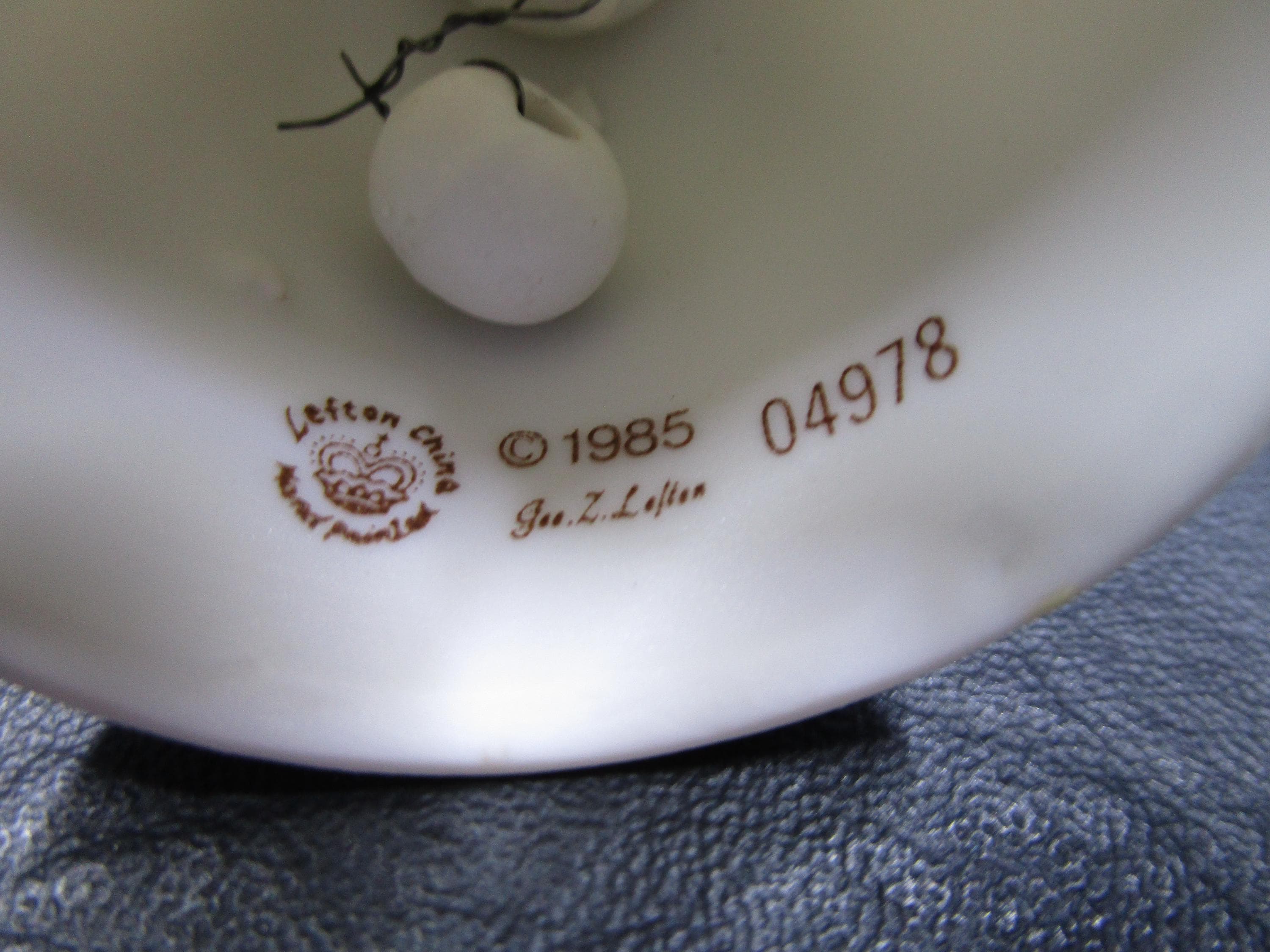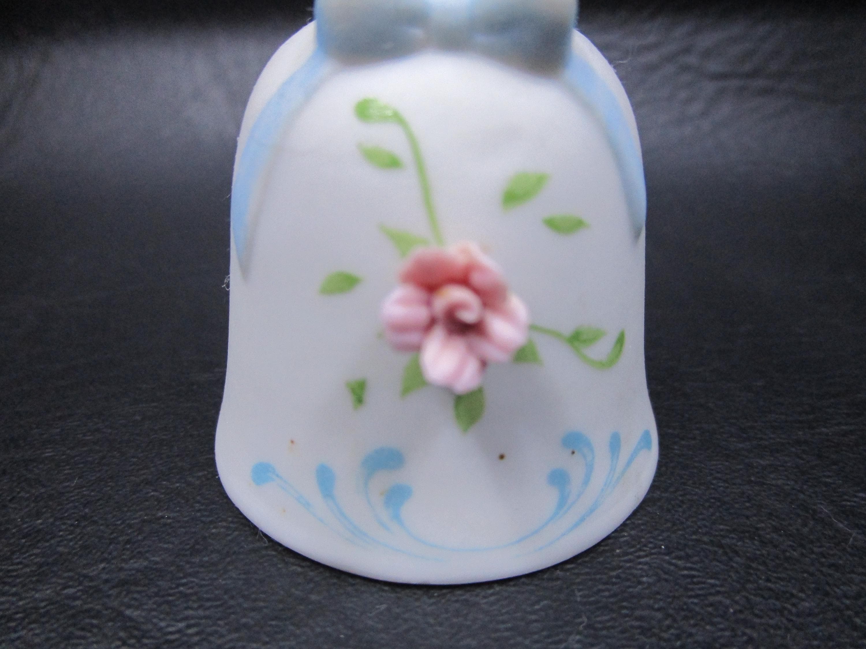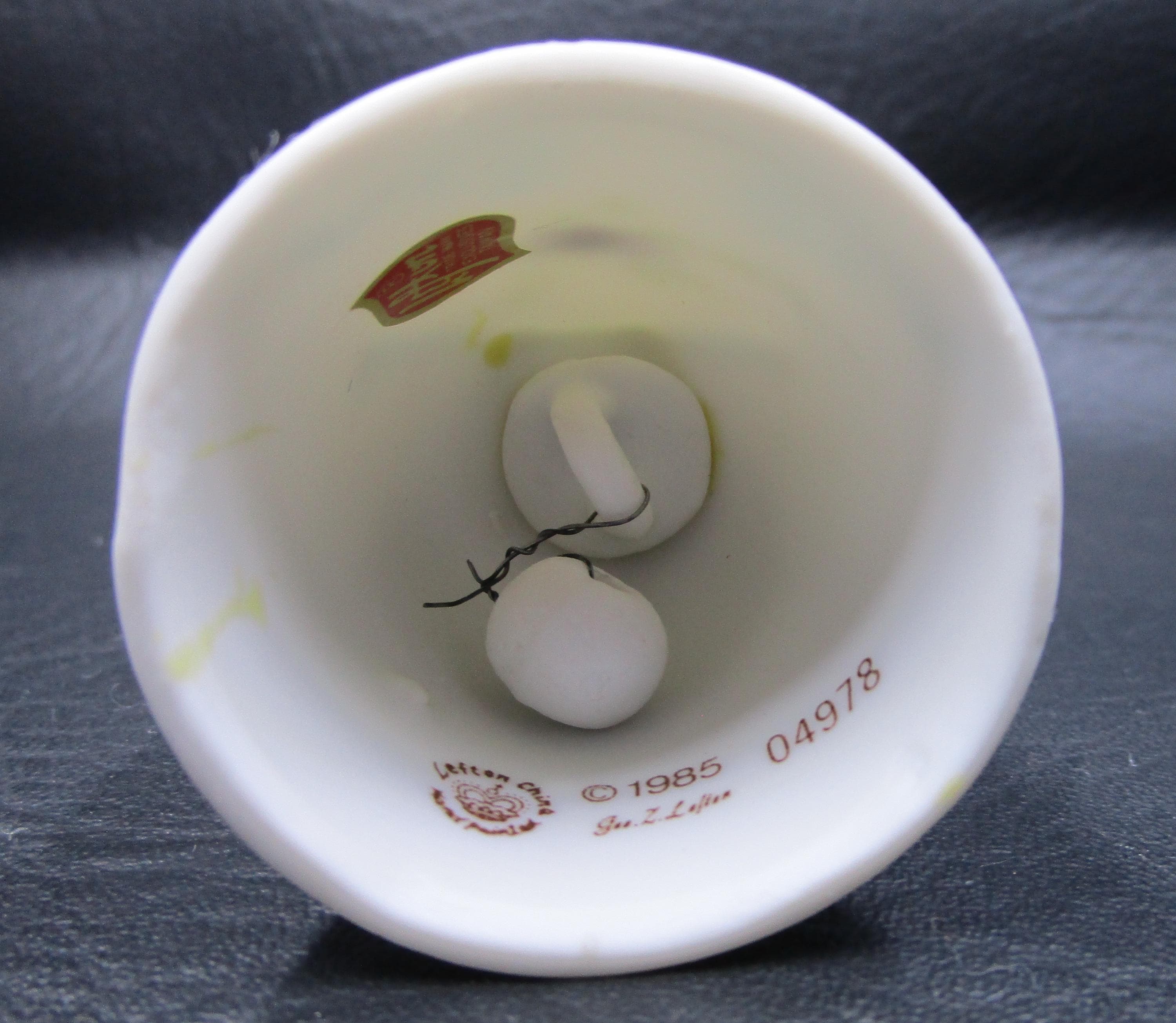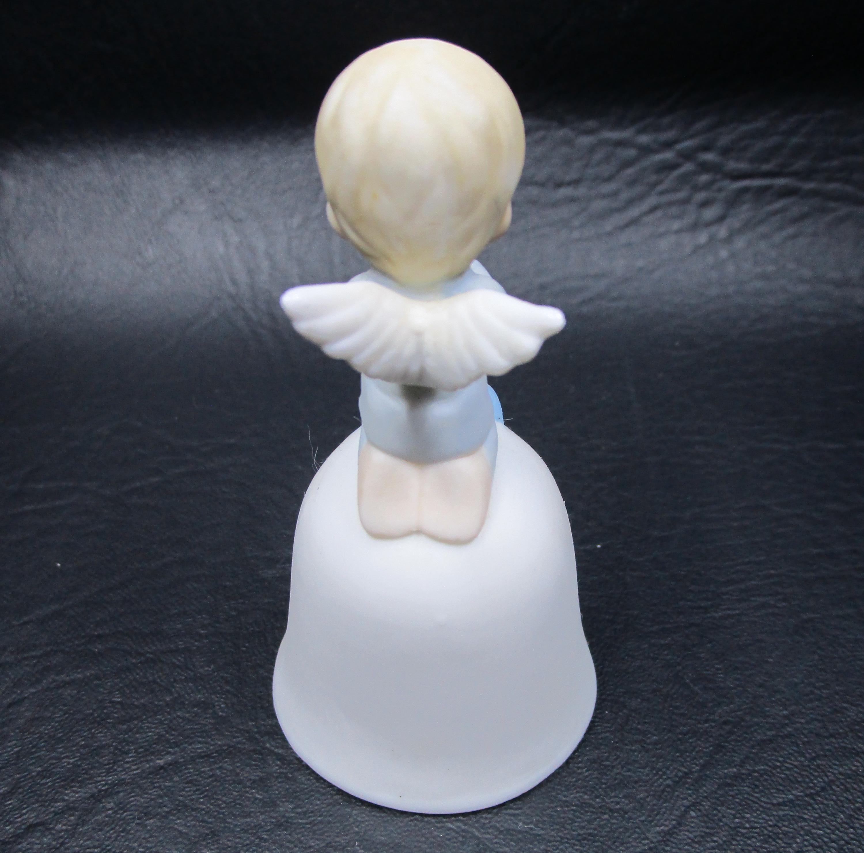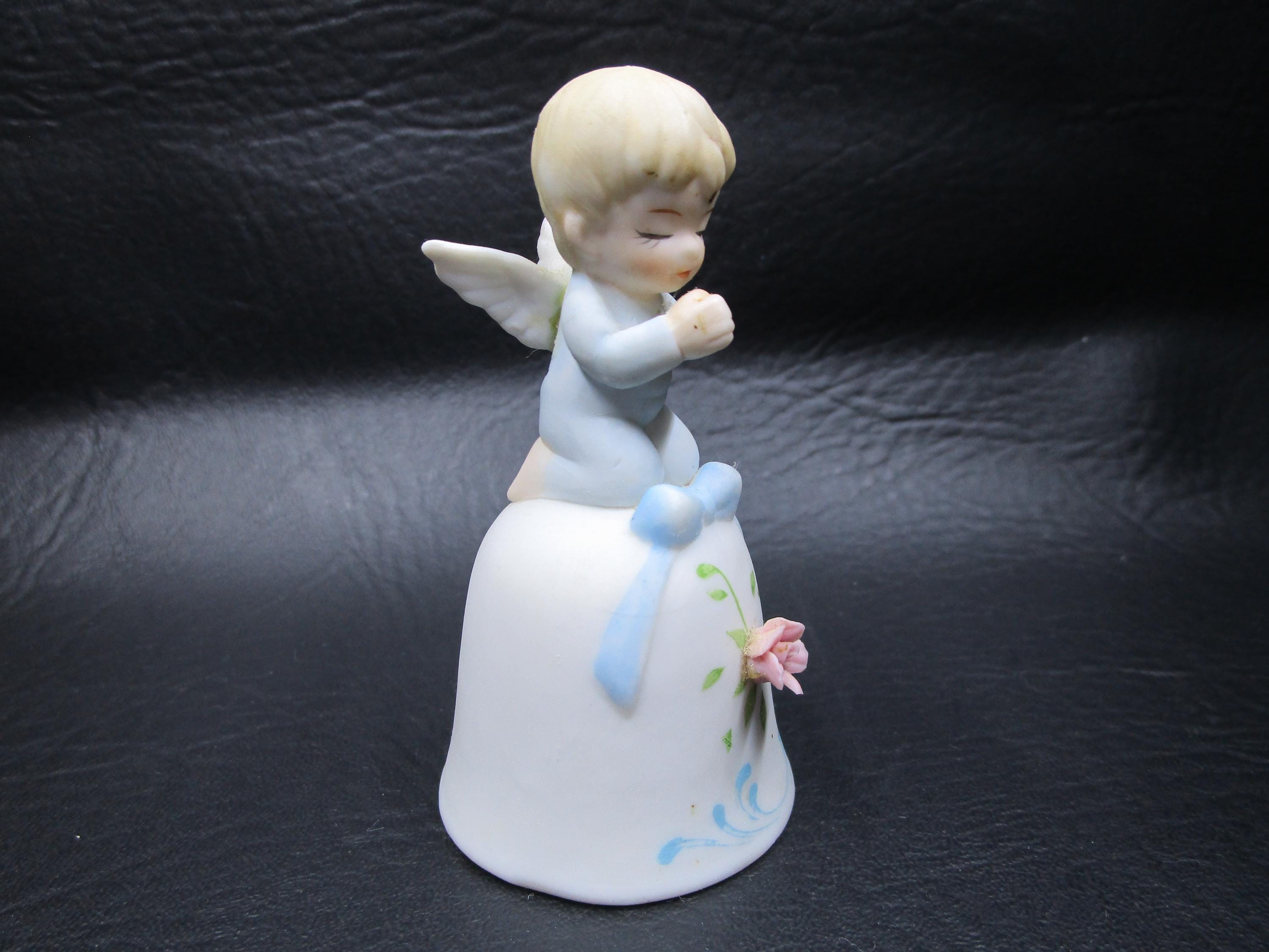 Measures 3" tall, 1 3/4" wide, with Lefton's mark and foil sticker on inside, produced in 1985. This adorable blonde angel boy is saying his prayers, dressed in blue with white wings. His bell is white, with a single raised pink rose in the center. Bisque porcelain was used to craft this little jewel, and has hand painted details.