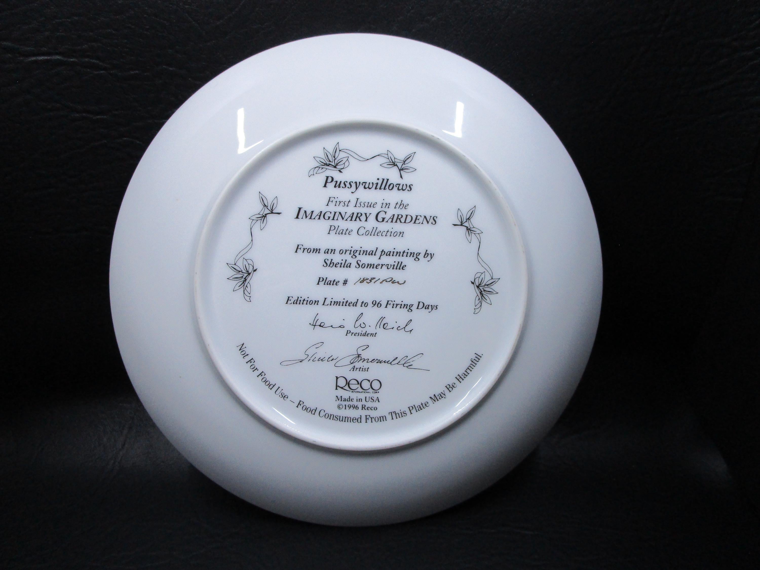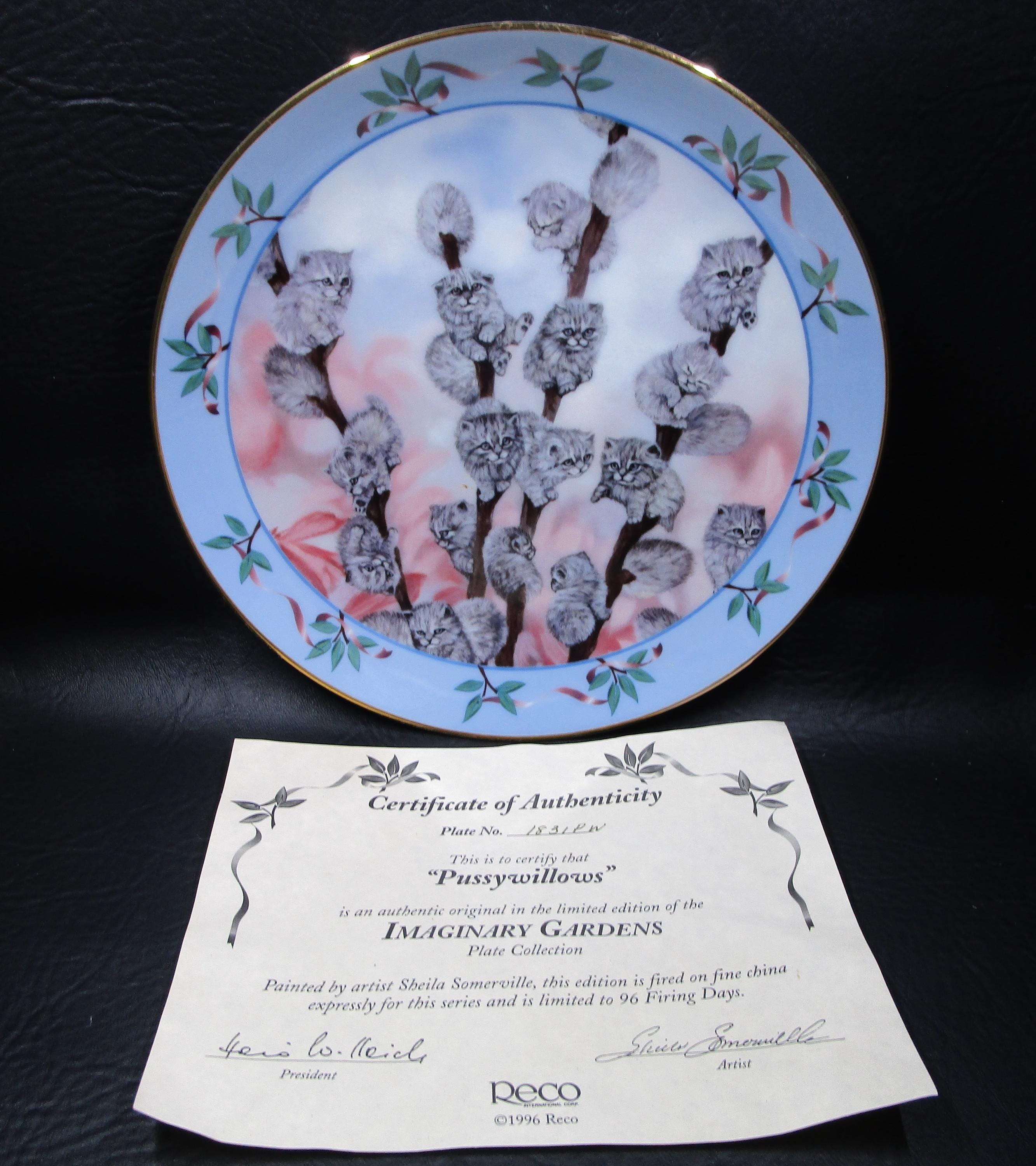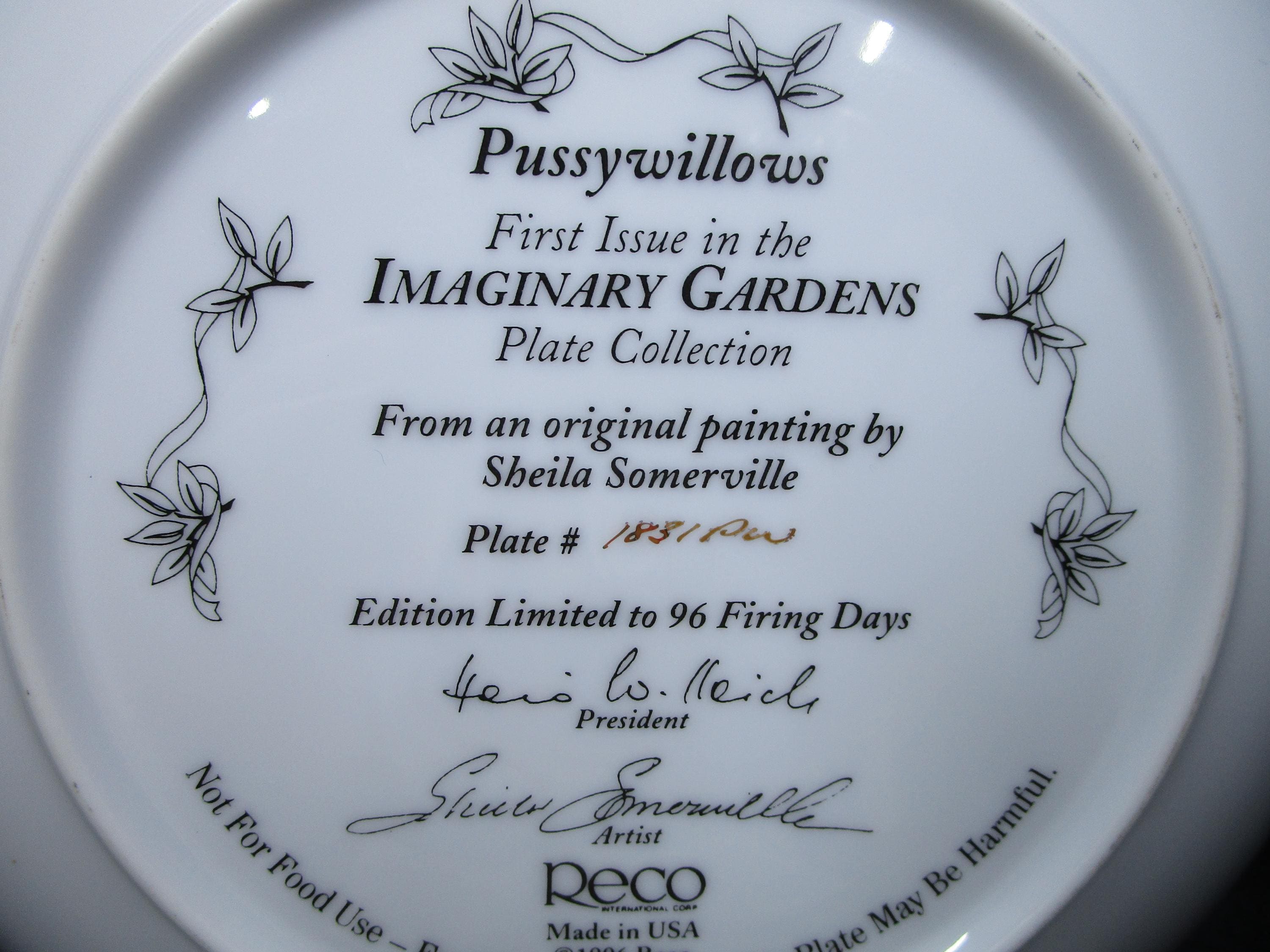 "Pussywillows", art by Shiela Somerville, is an adorable plate, part of Reco's 1996 IMAGINARY GARDENS plate collection. Whimsical art depicts cute gray kittens as the balls of cotton on the pussywillow plant. Presented by Recoin limited edition manufacturing. First Edition, Plate No. 1839PW. Made from fine porcelain, with a single gold line on edge. Not to be used for food.