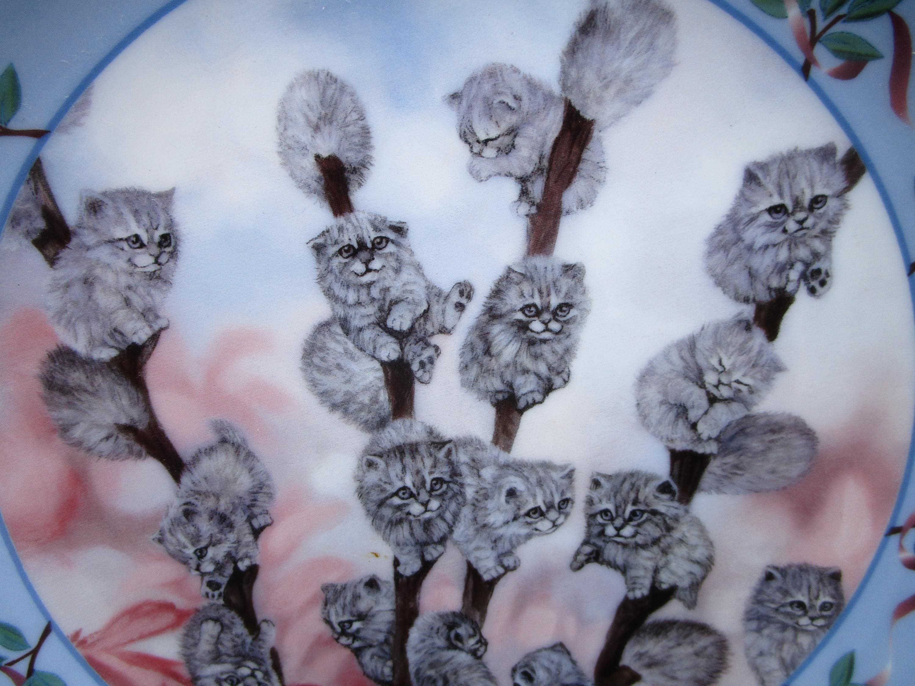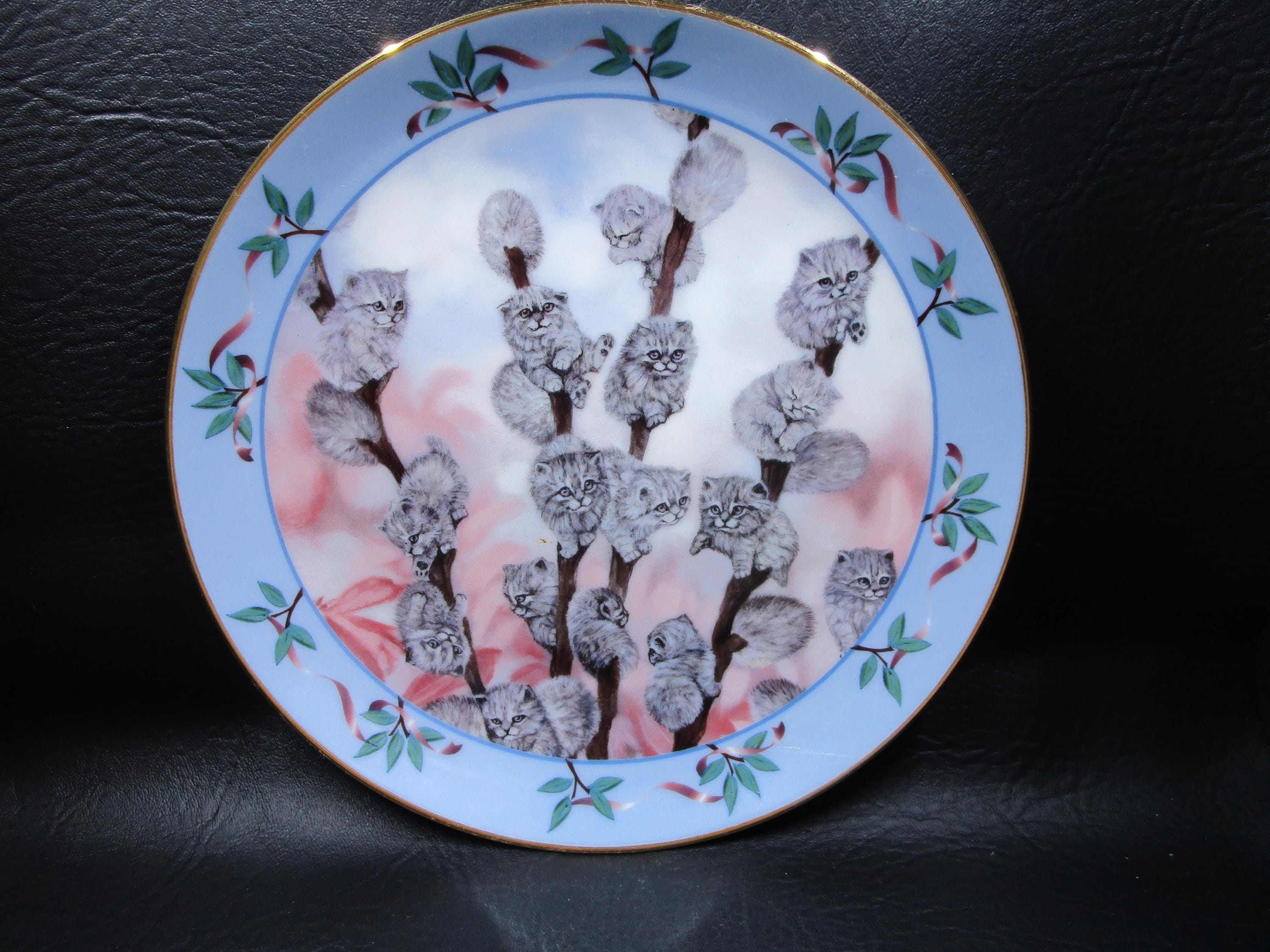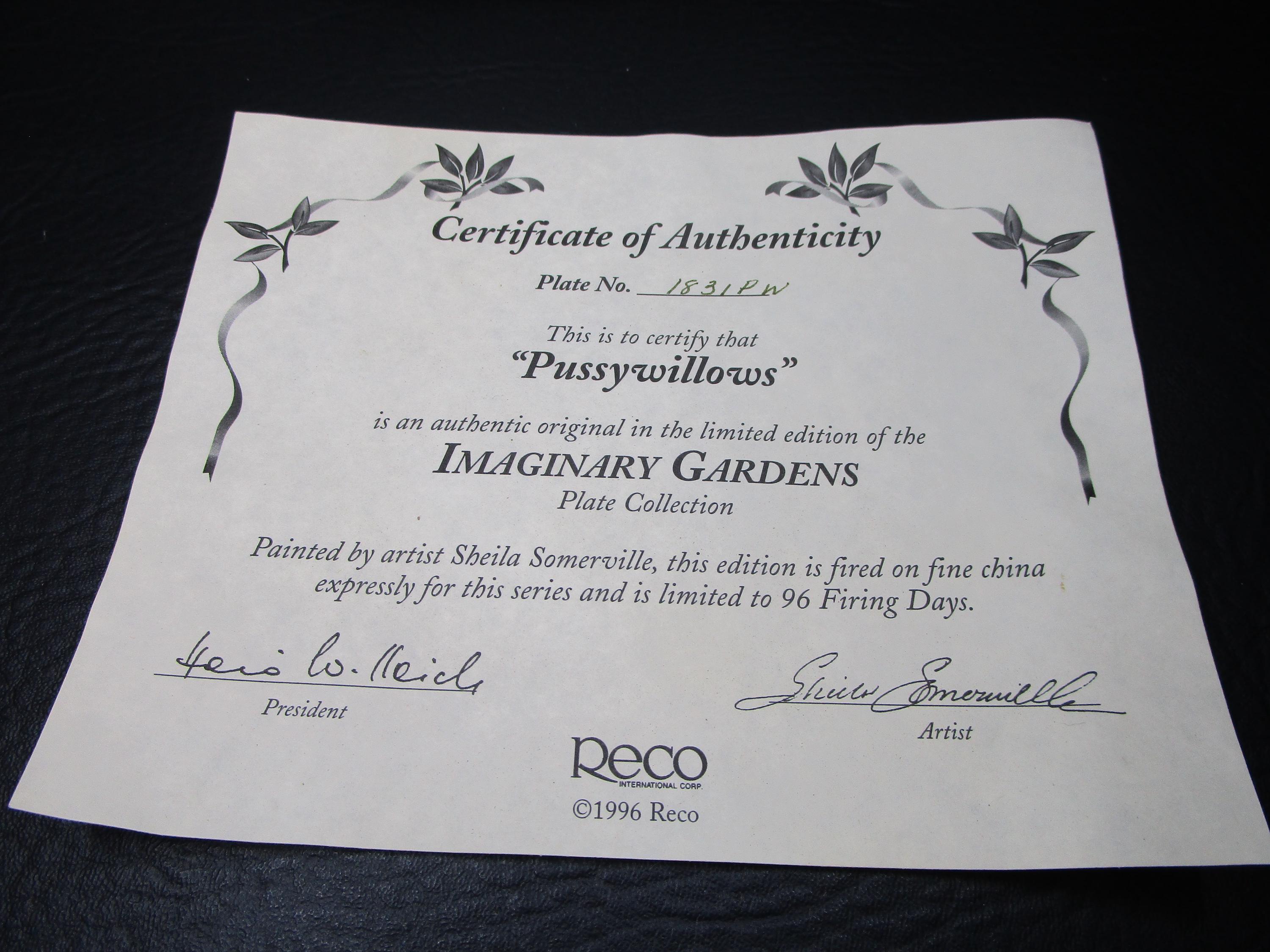 "Pussywillows", art by Shiela Somerville, is an adorable plate, part of Reco's 1996 IMAGINARY GARDENS plate collection. Whimsical art depicts cute gray kittens as the balls of cotton on the pussywillow plant. Presented by Recoin limited edition manufacturing. First Edition, Plate No. 1839PW. Made from fine porcelain, with a single gold line on edge. Not to be used for food.