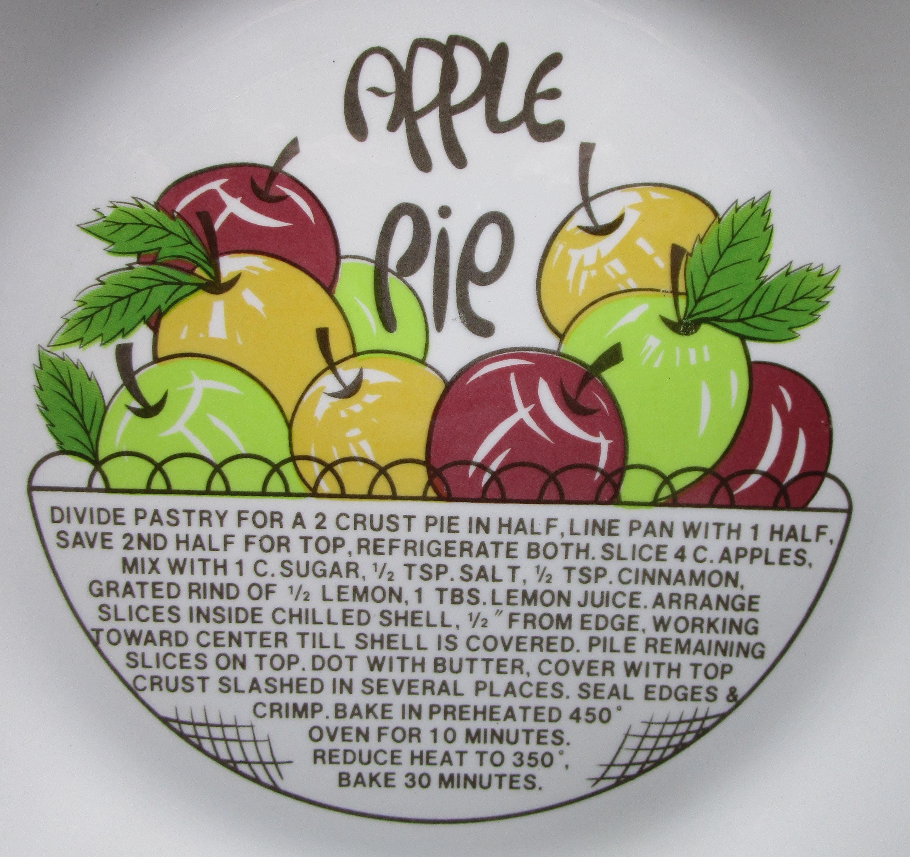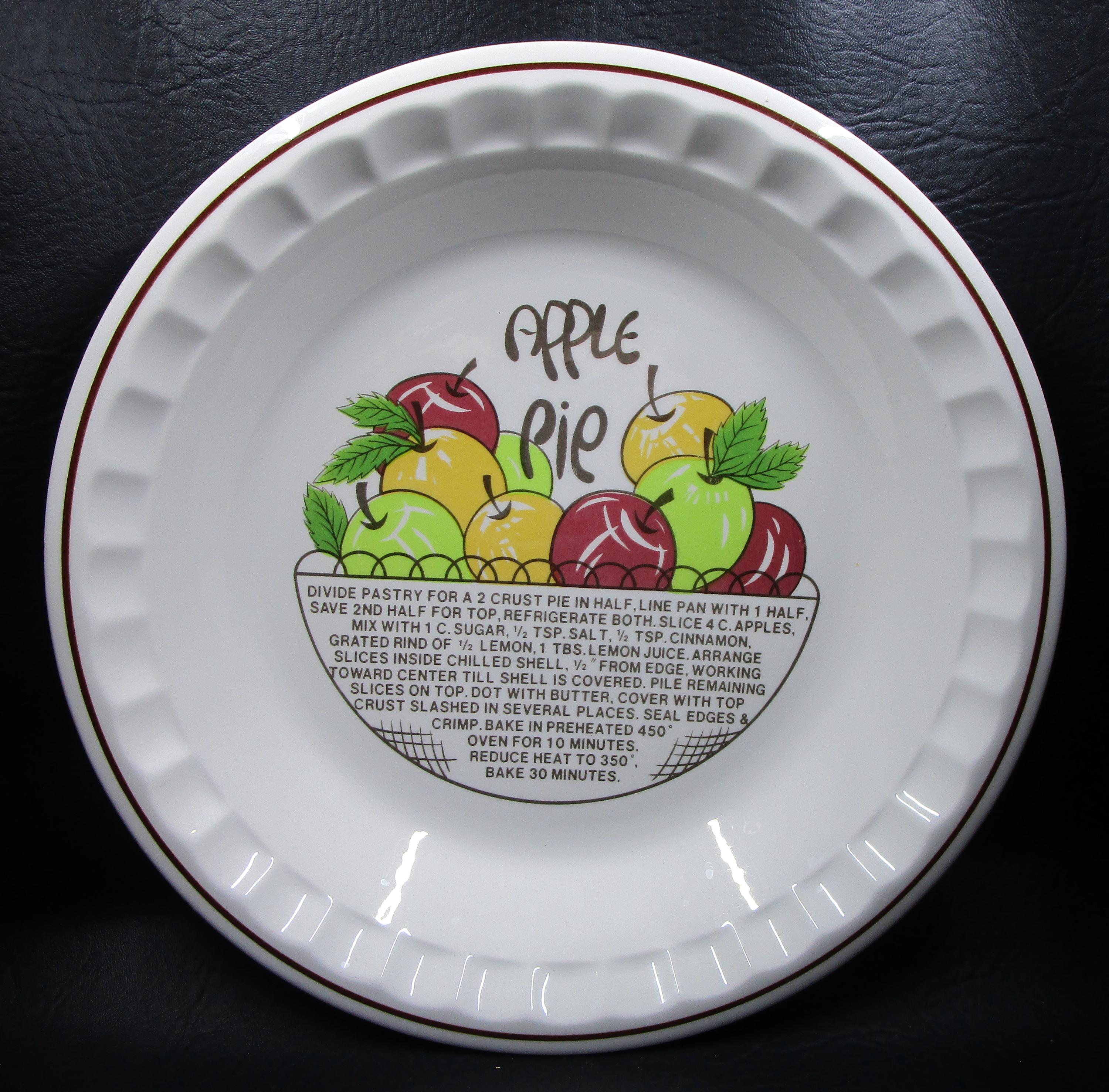 Item: Durable and heat-resistant ceramic pie plate, featuring the phrase "apple pie" and the recipe. Plate measures 10" diameter, about 1 1/2" deep. No maker mark to indicate origin, other than KOREA on bottom. In great vintage condition -- no chips, cracks, scratches, repairs, stains.