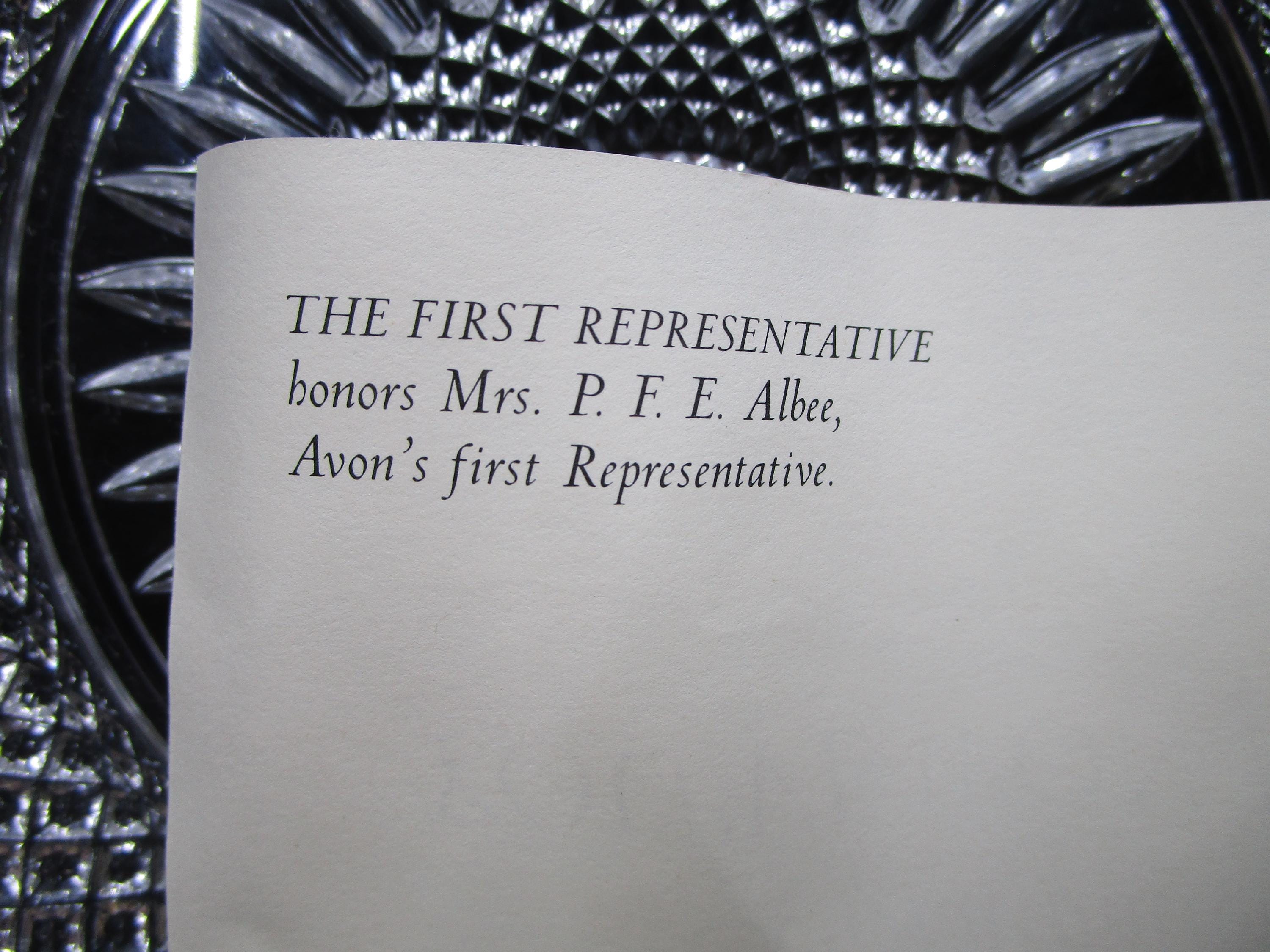 The 8" plate's center features the likeness of Avon's first representative, Mrs. P. F. E. Albee. Plate is in excellent condition -- no chips, cracks, scratches, repairs. Original card of congratulations is included.