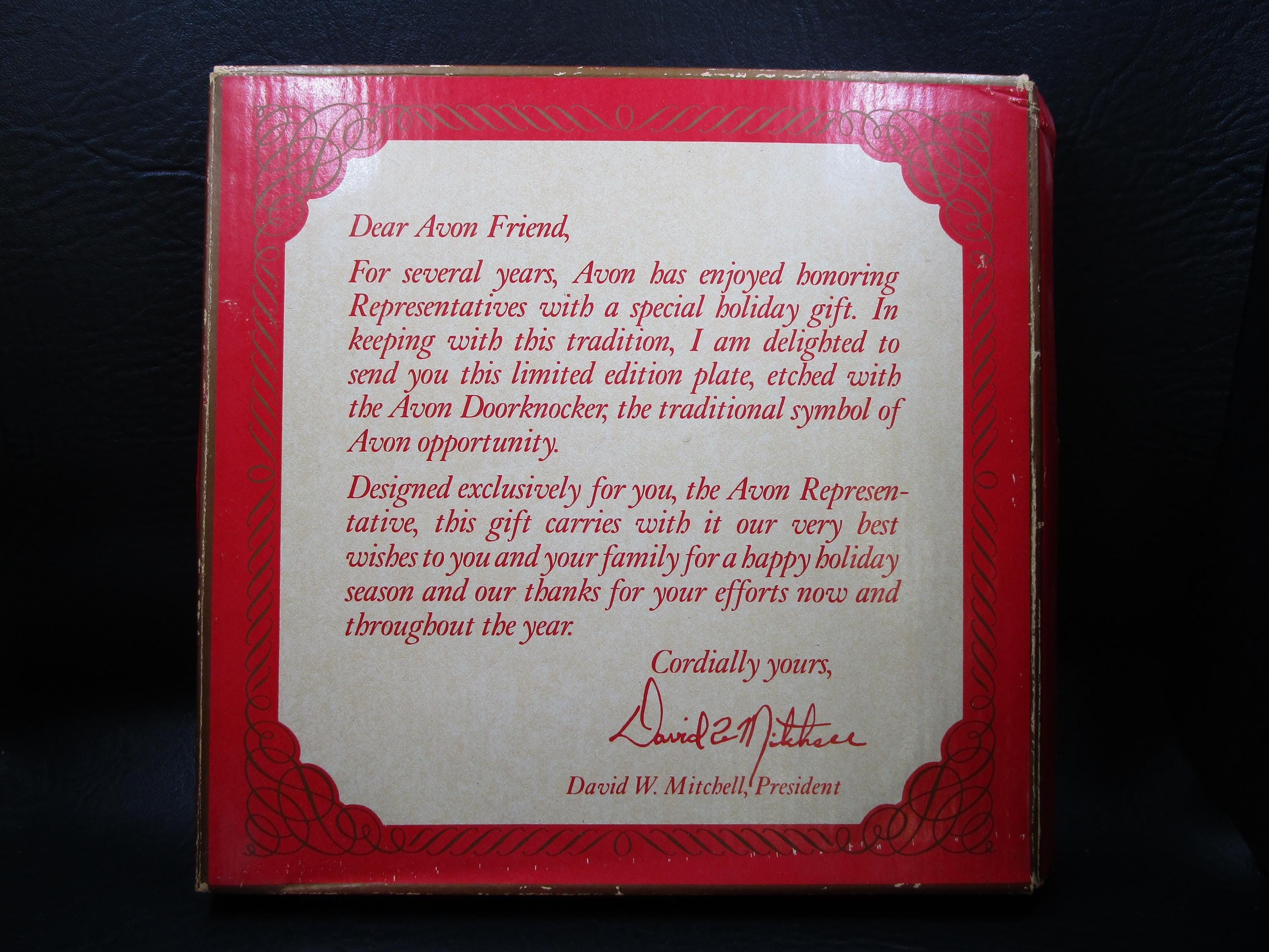 The Doorknocker, Avon's symbol of welcome service, is featured on this plate, awarded to Representatives during Christmas-time. This eight-inch decorative plate was pressed exclusively for Avon, with the mold broken after production so no duplicates could be issued. Plate is in pristine condition, appears never to have been used. Comes in original box.