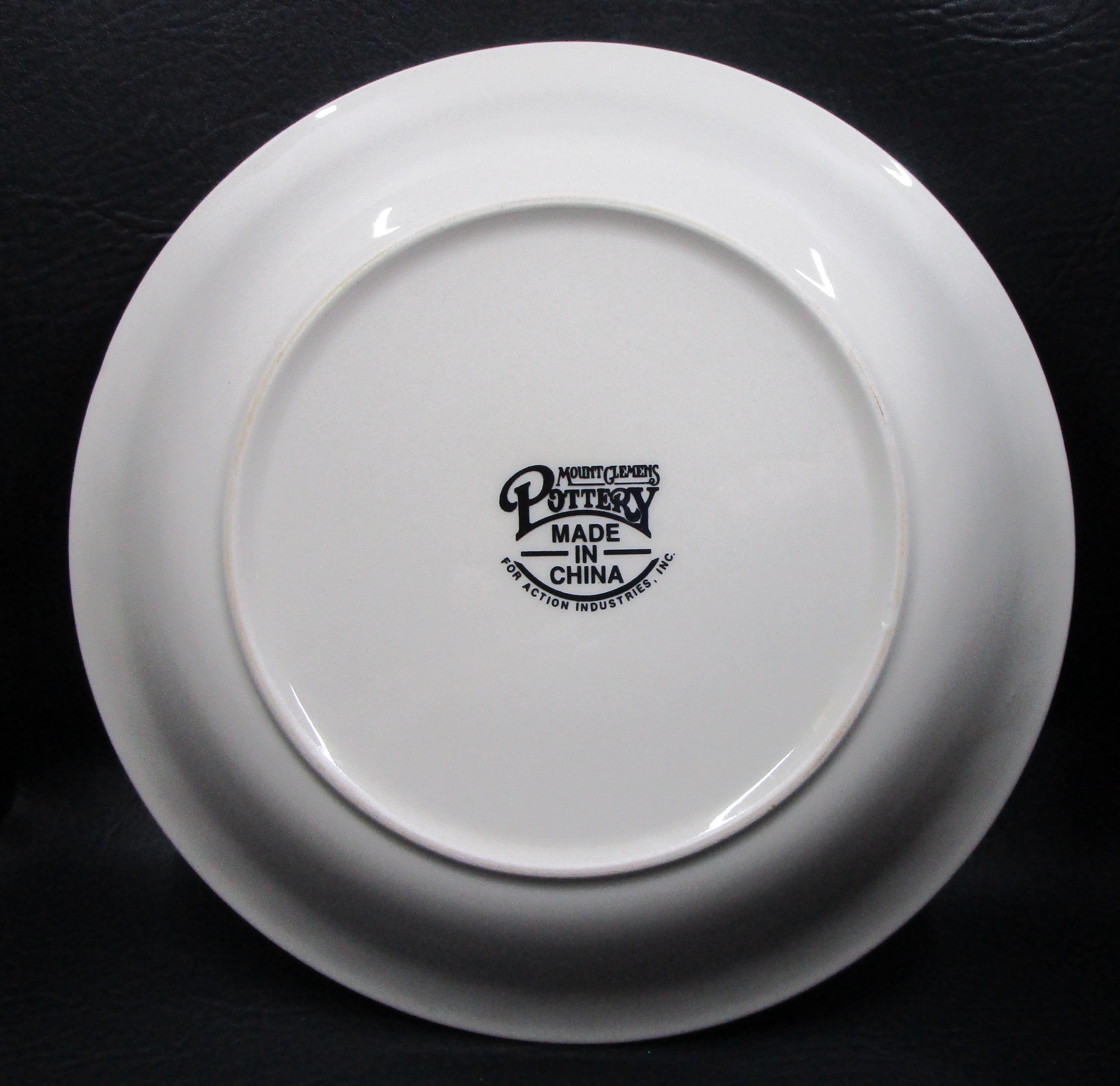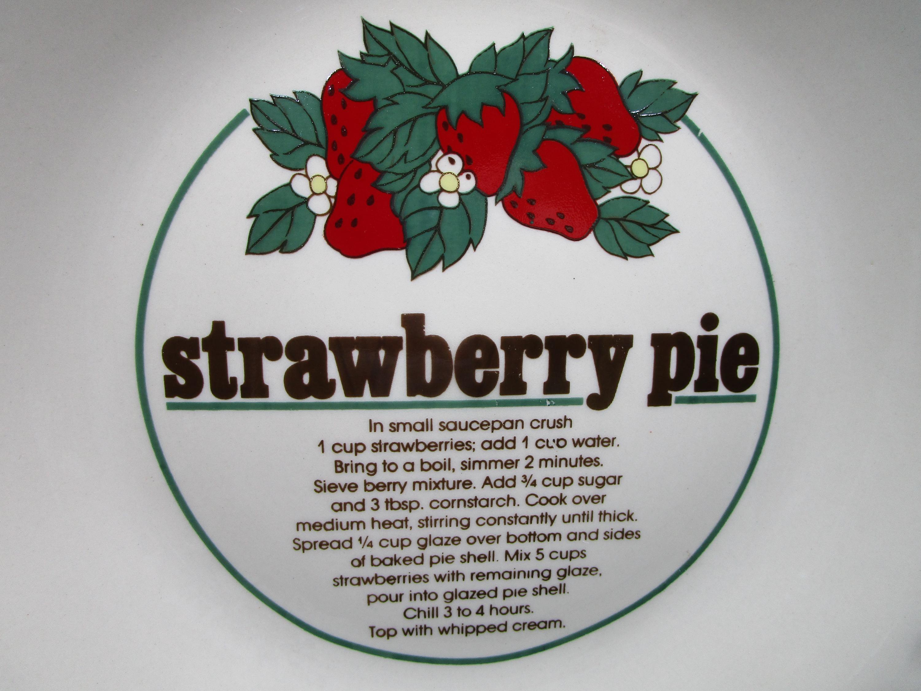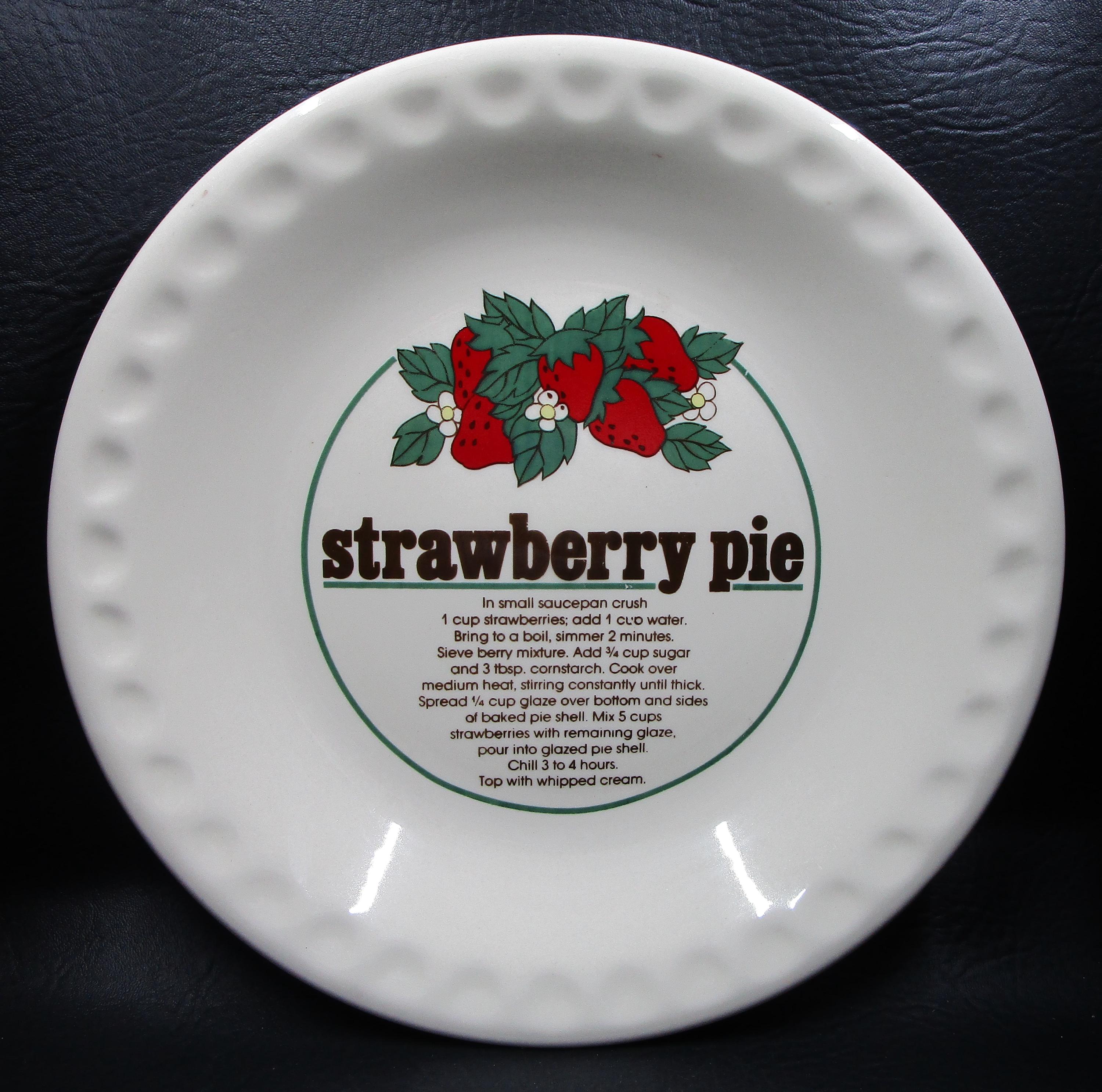 Item: Durable and heat-resistant ceramic pie plate, featuring the phrase "strawberry pie" and the recipe. Plate was made by Mount Clemens Pottery, measures 10" diameter, about 1 1/2" deep. In great vintage condition -- no chips, cracks, scratches, repairs, stains.
