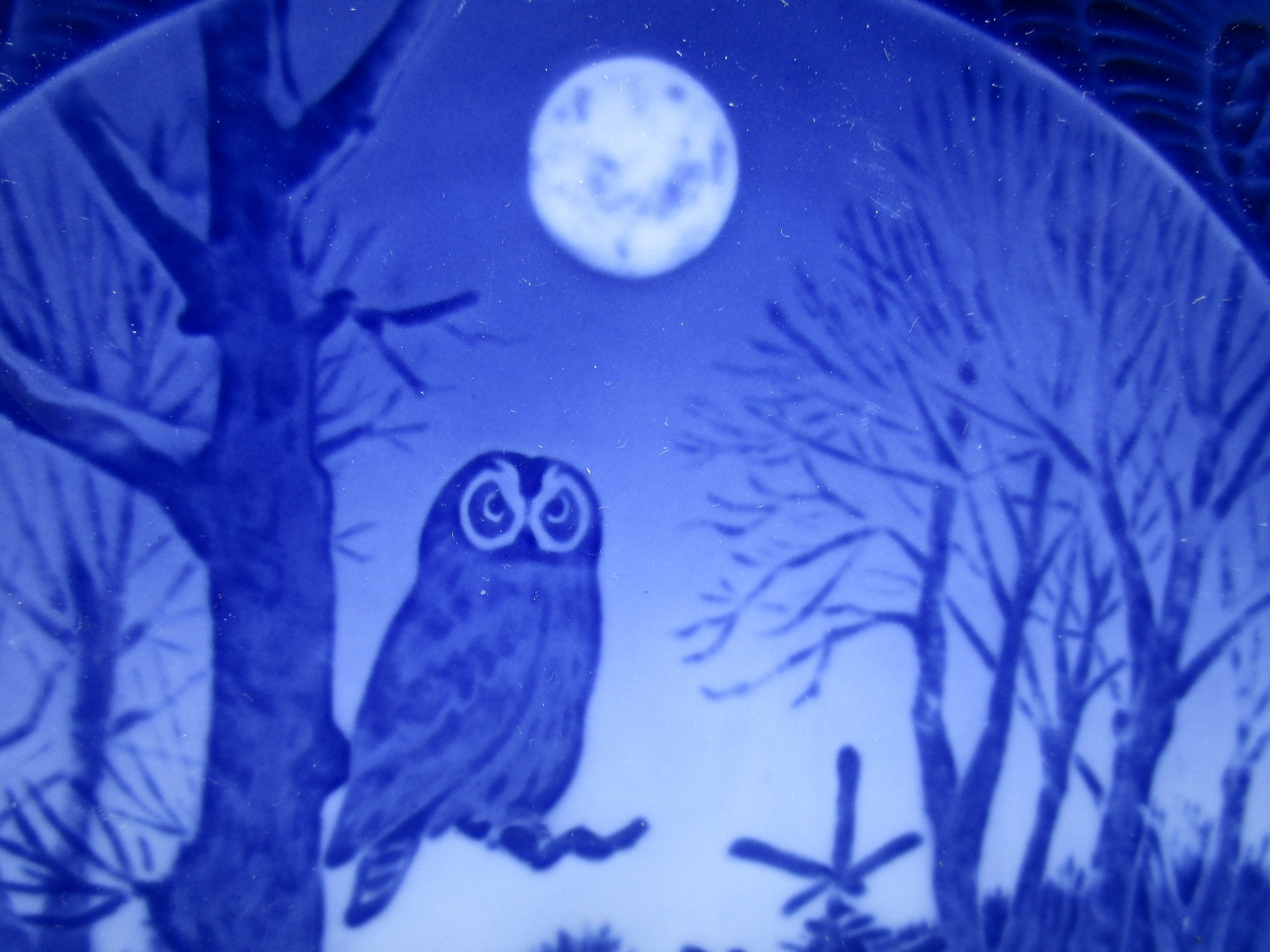Plate Front: Owl sits on a tree branch, under the full moon.