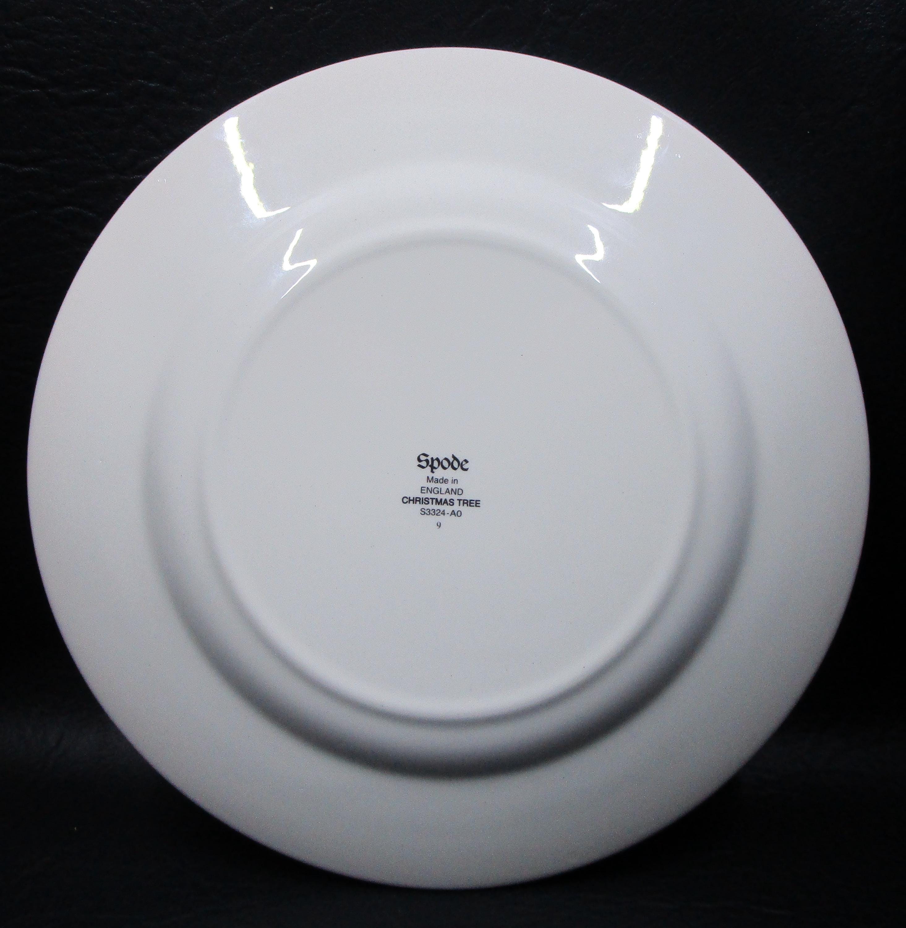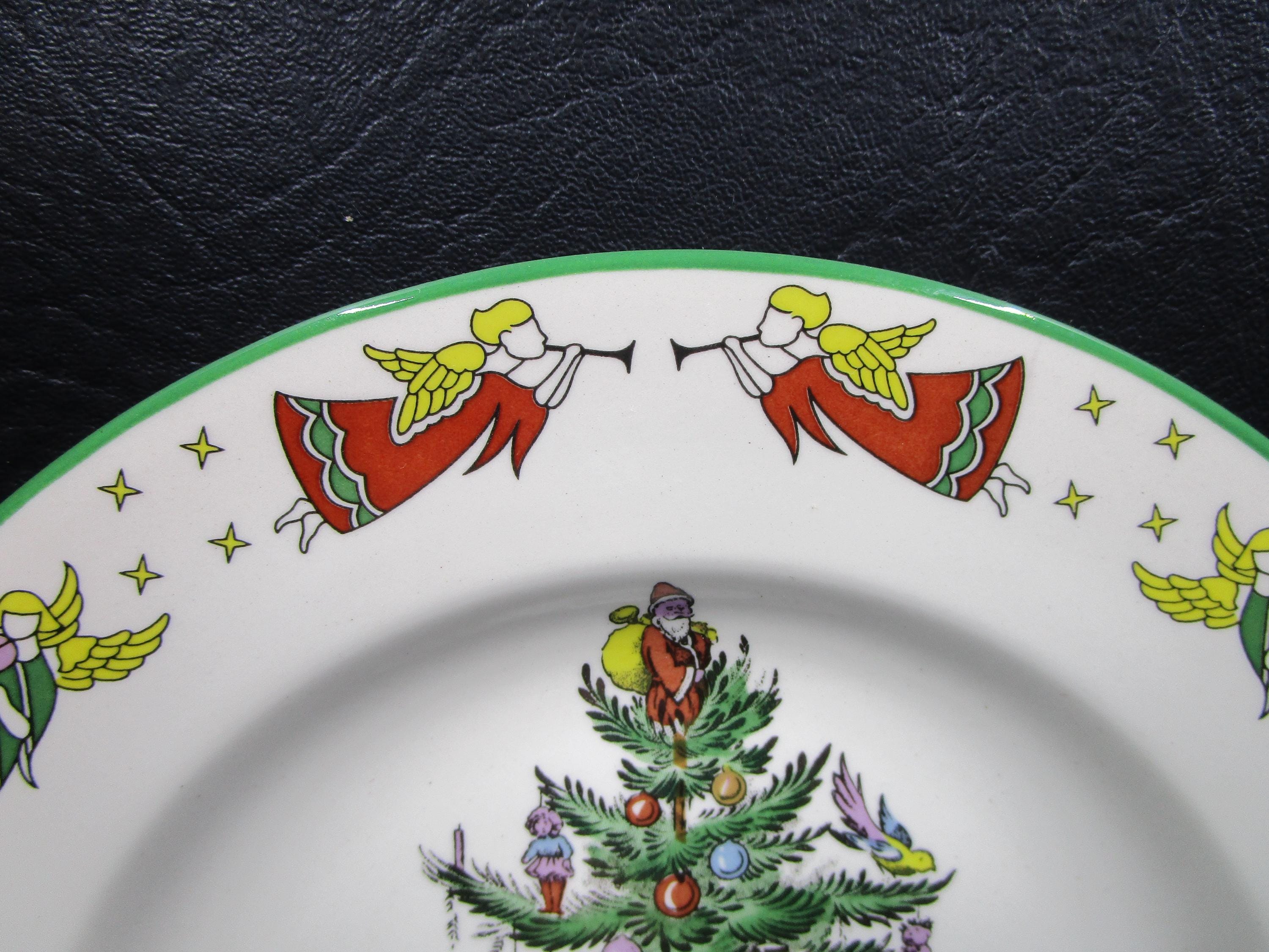 Plate Front: Traditional Christmas tree motif first used in 1937 with green rim, updated with an Angel Choir motif
