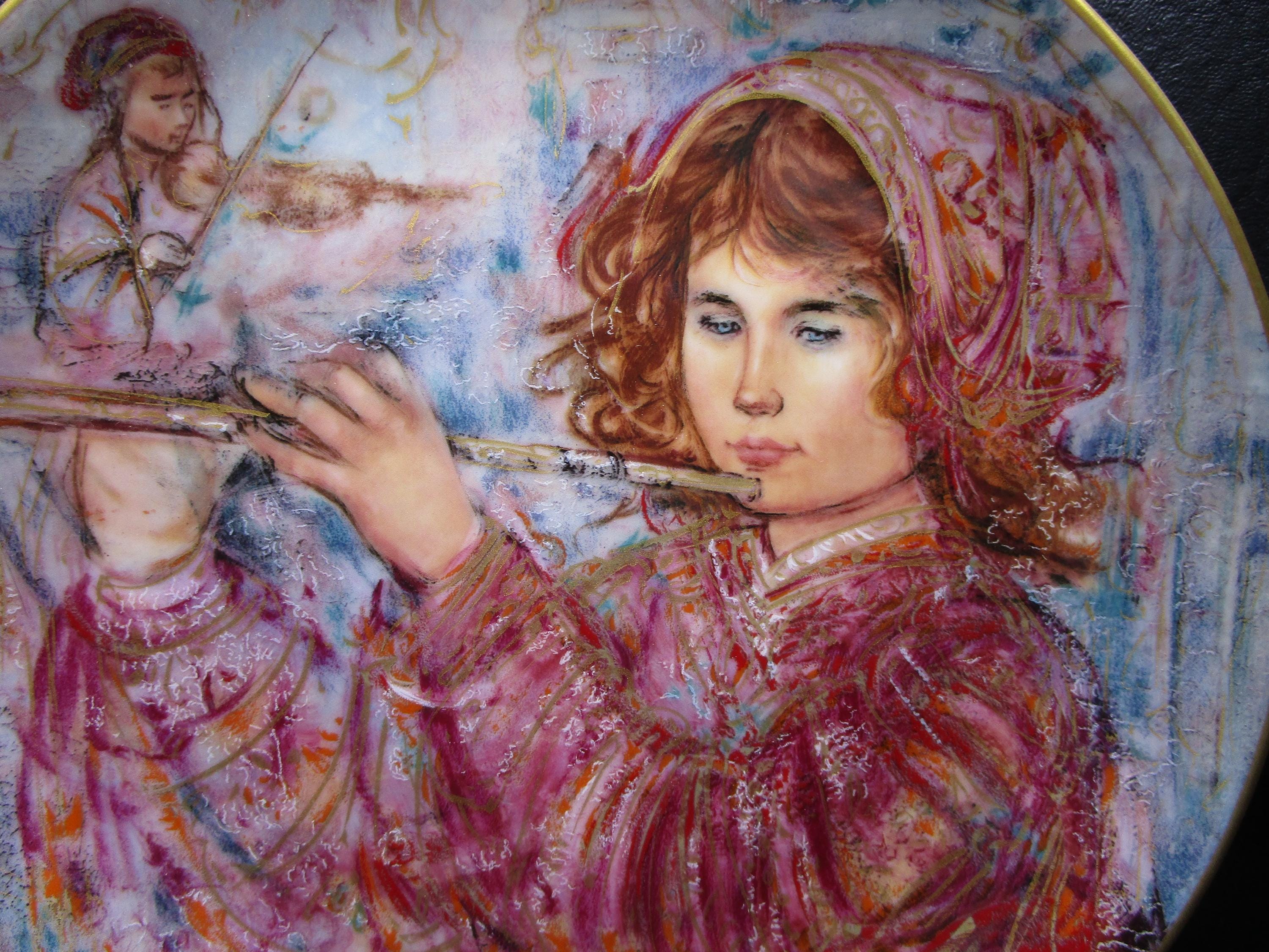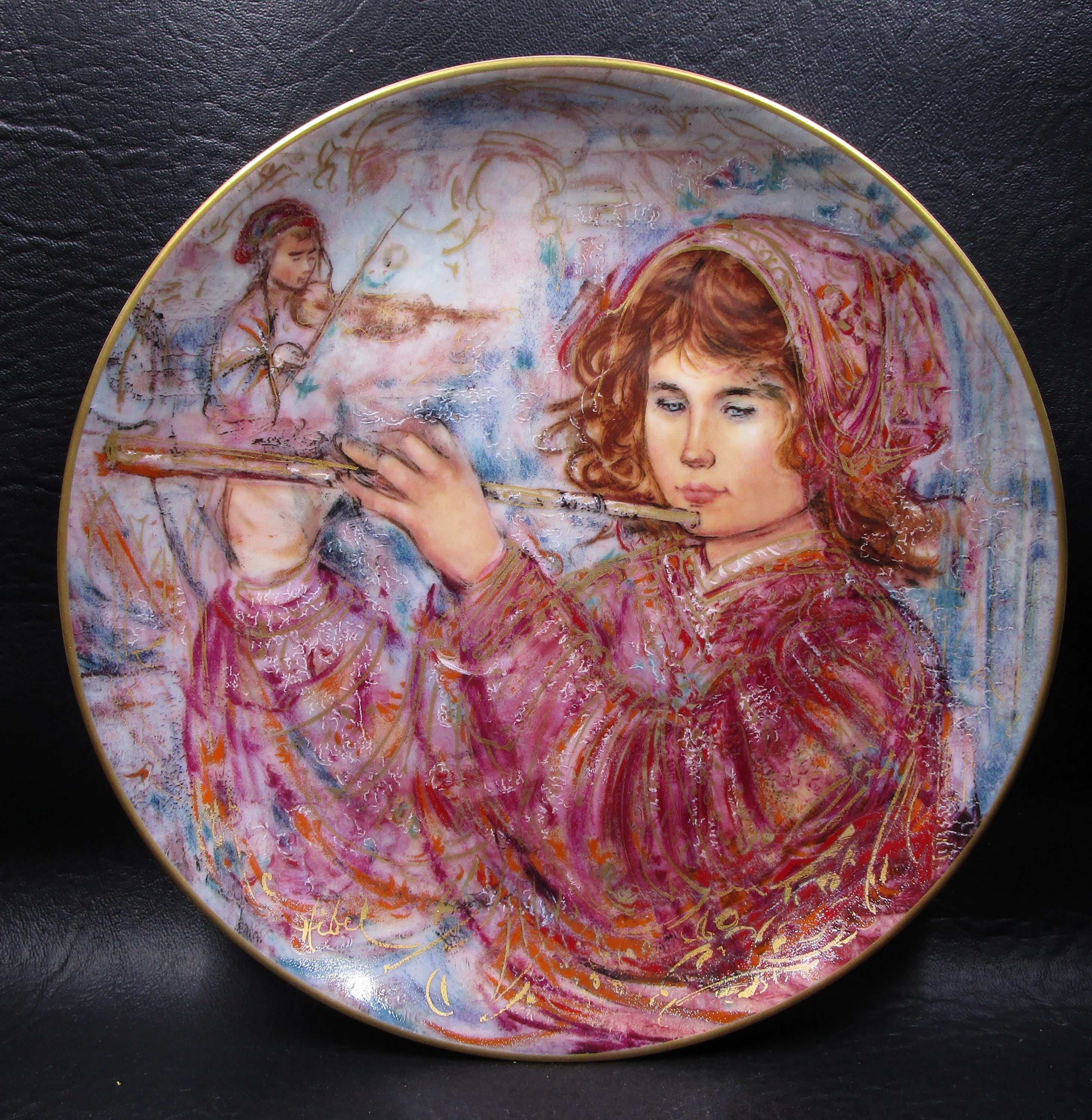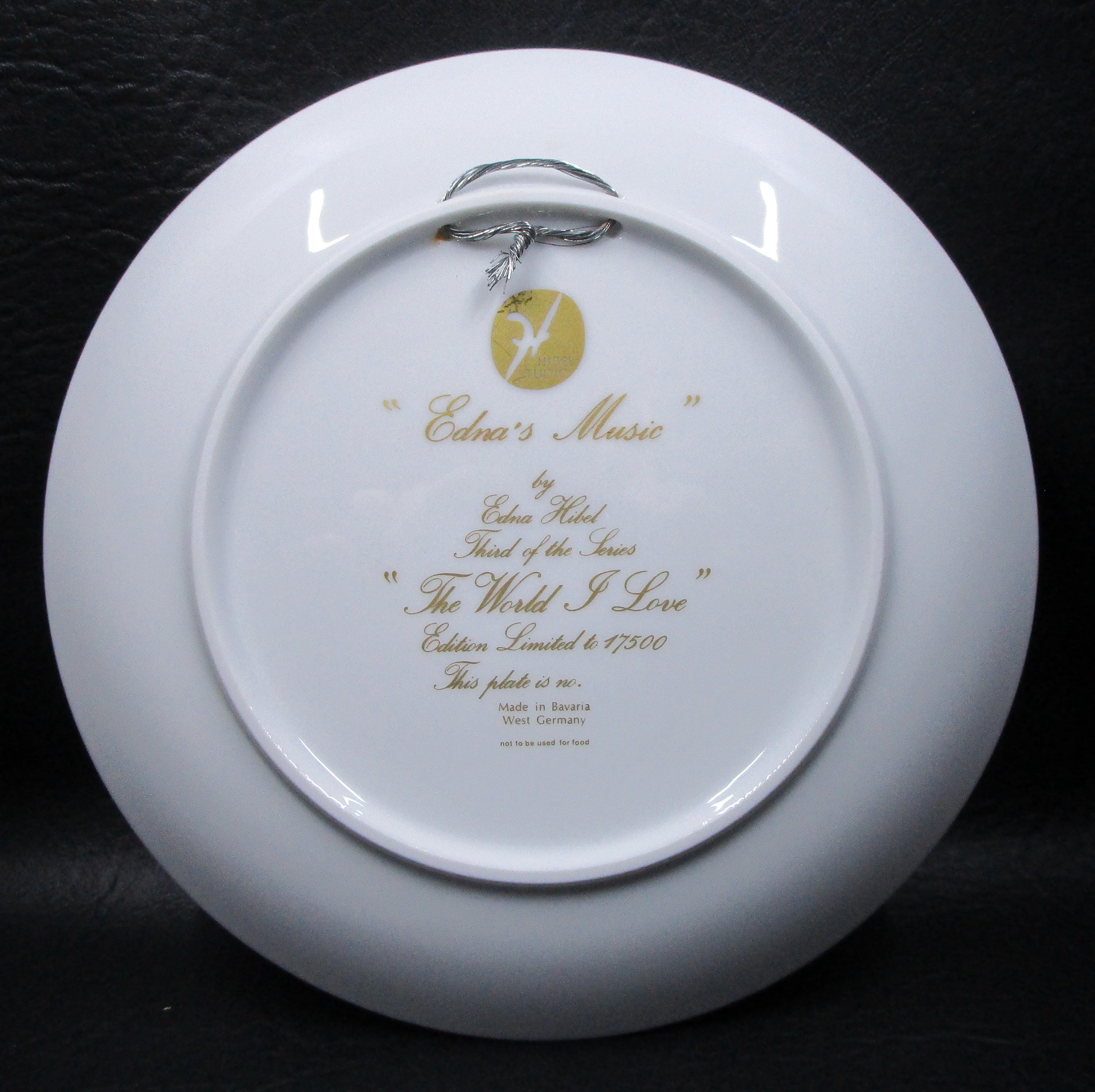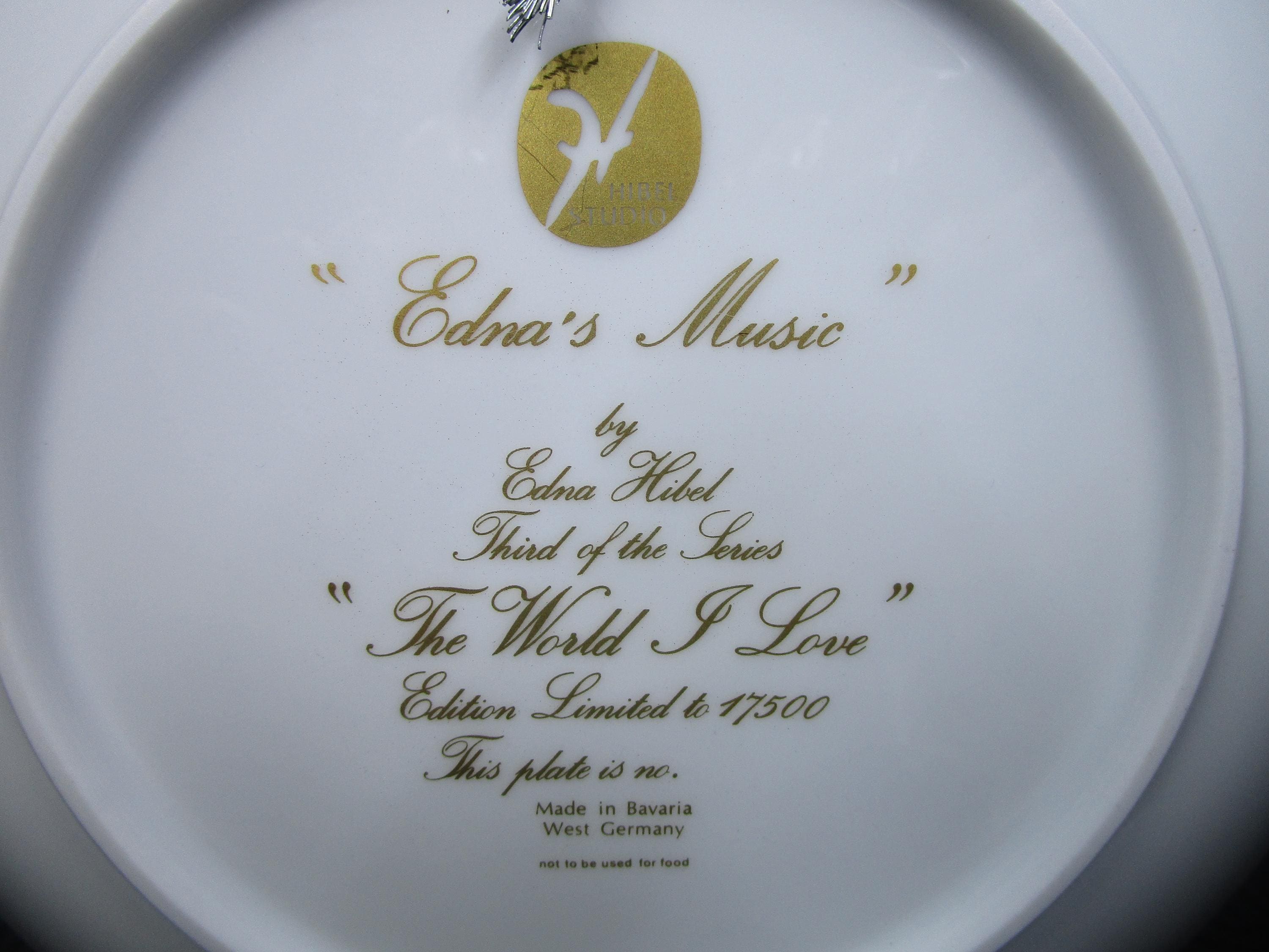 Artist Edna Hibel created a series of collector plates known as "The World I Love," in the 1980. This plate is titled, "EDNA'S MUSIC." Plate is in excellent condition. Measures 7 1/2" diameter, edged in gold.