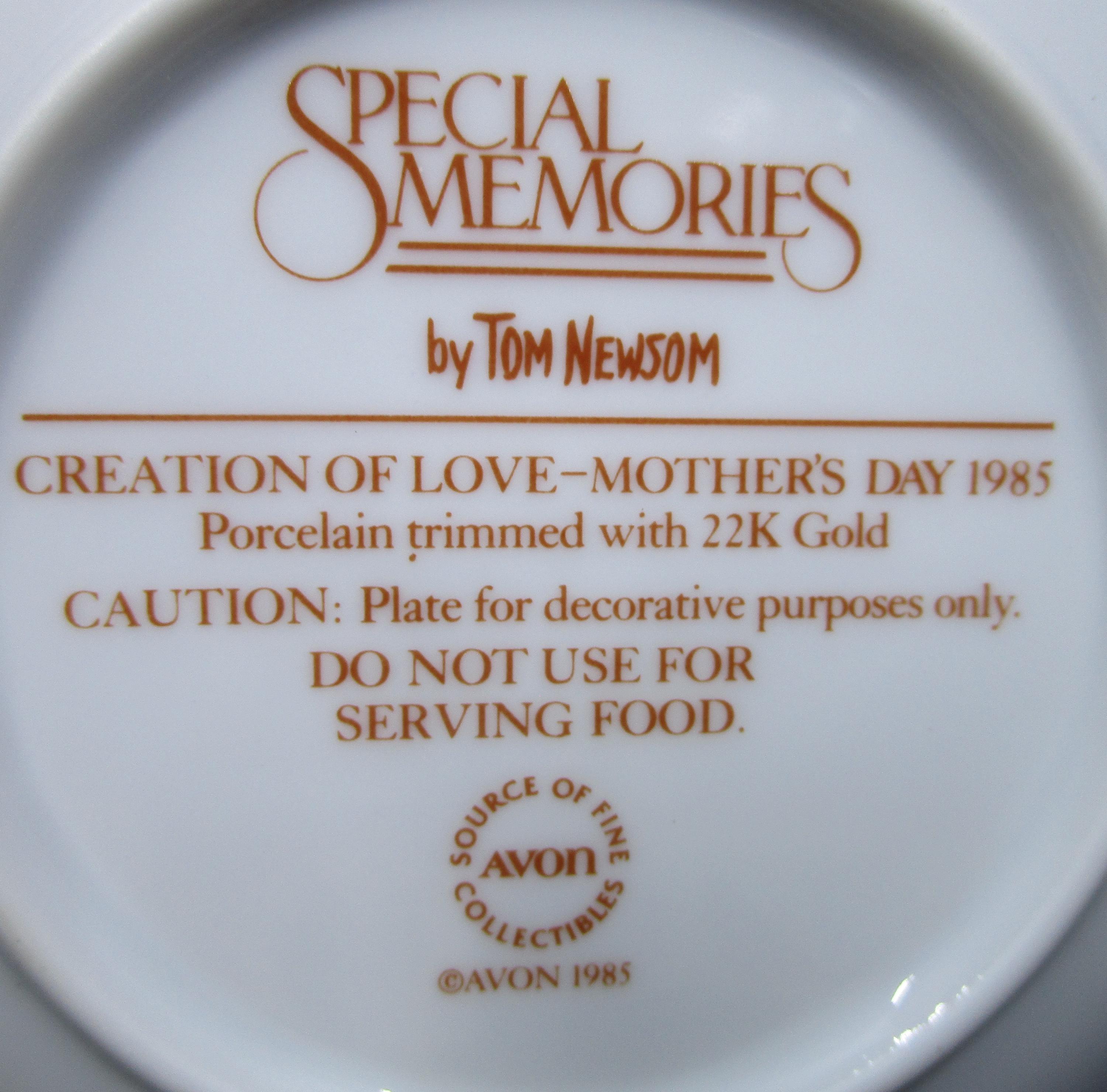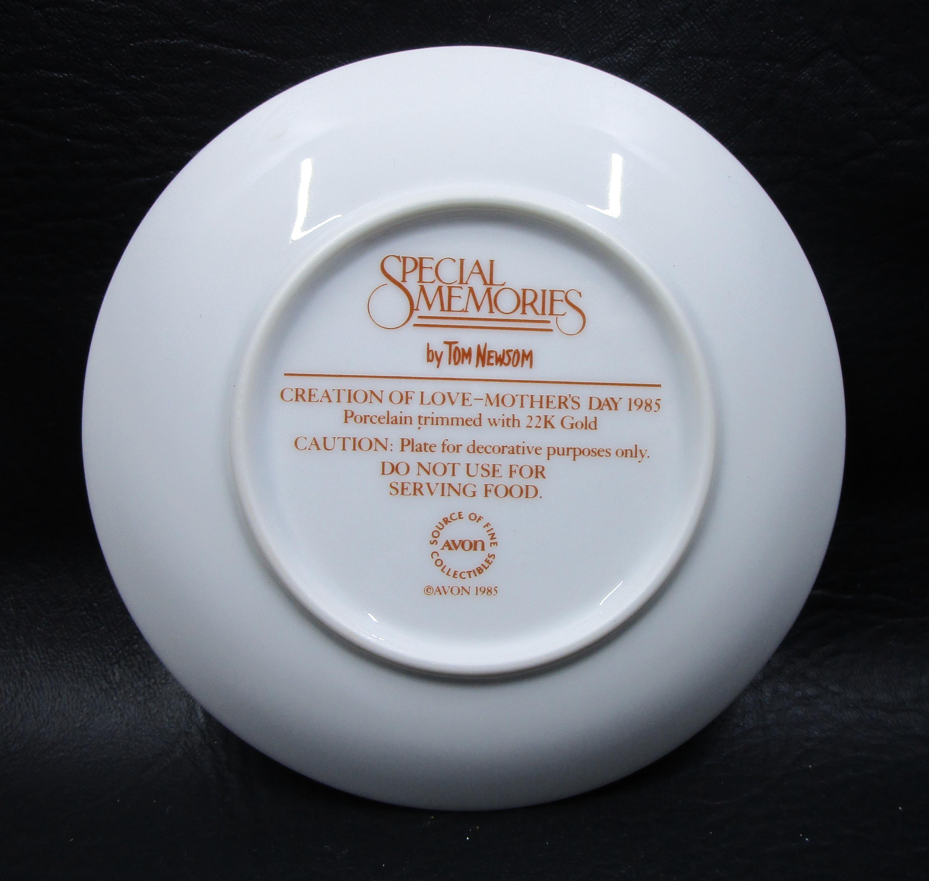 1985 Avon "Special Memories" series Mother's Day Plate, featuring artwork of Tom Newsom This 5 1/4" diameter porcelain plate is titled CREATION OF LOVE, is trimmed in 22K gold. Item is in great vintage, pre-owned condition. No chips, cracks, scratches, repairs. (Note: No box or COA available for this item.)