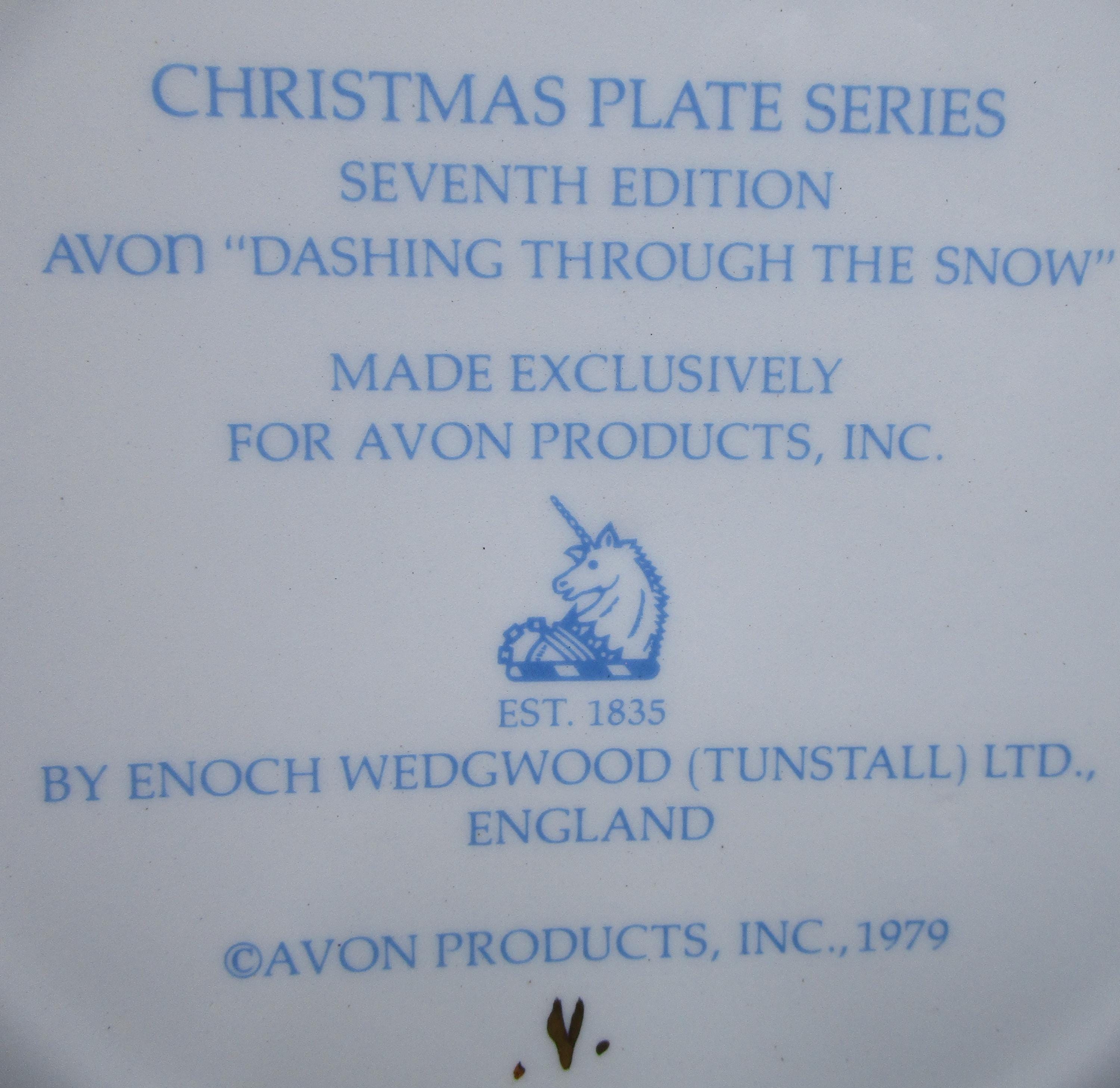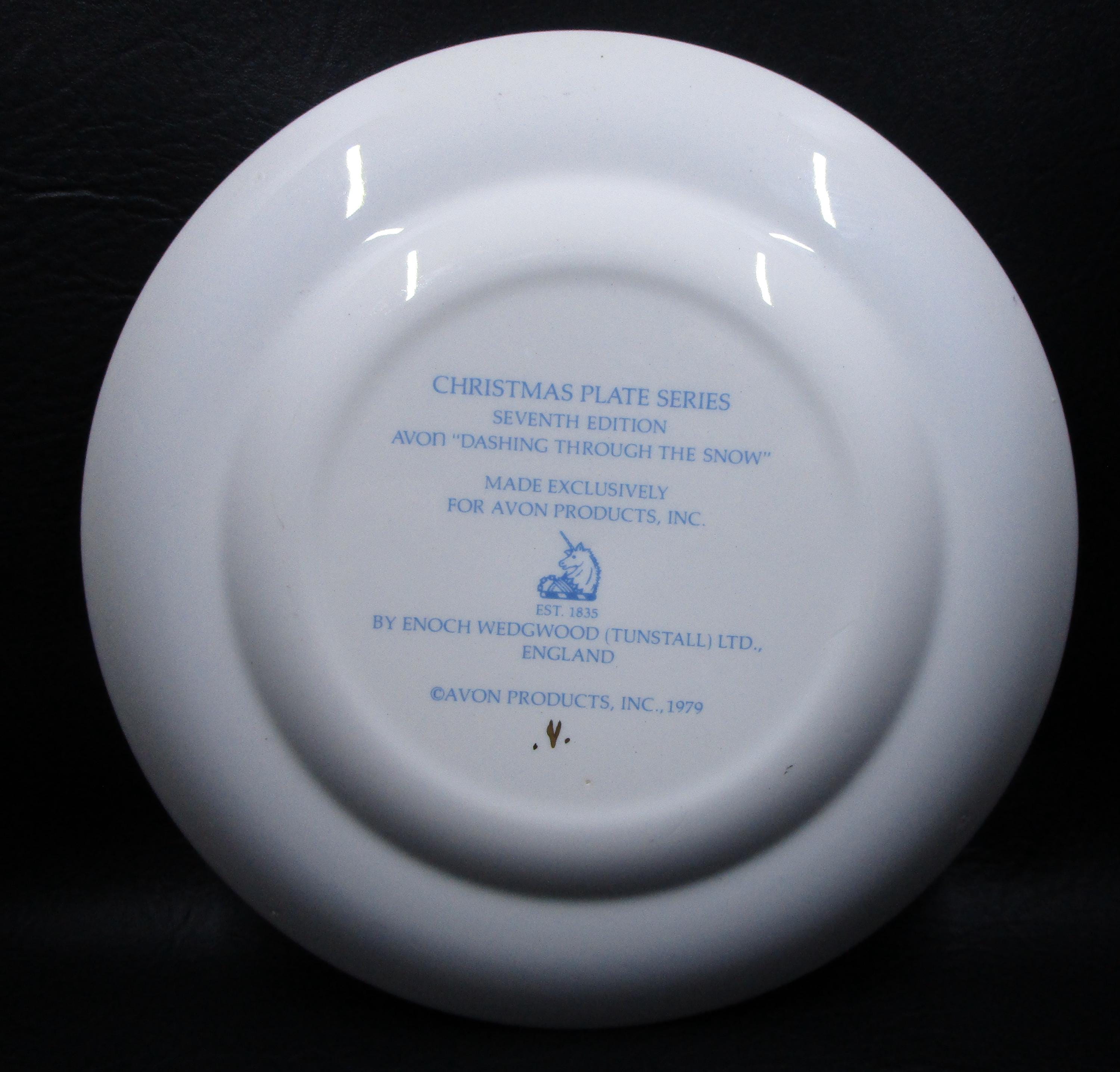 A clean vintage item for collectors, this item is the 1979 edition in the Avon Country Christmas, Christmas Plate Series, from Enoch Wedgwood. Artwork is titled, "Dashing Through the Snow!" Lovely, quality item, depicting Christmas festivities in the small, country village. Border is a pretty soft blue, edged with gold.