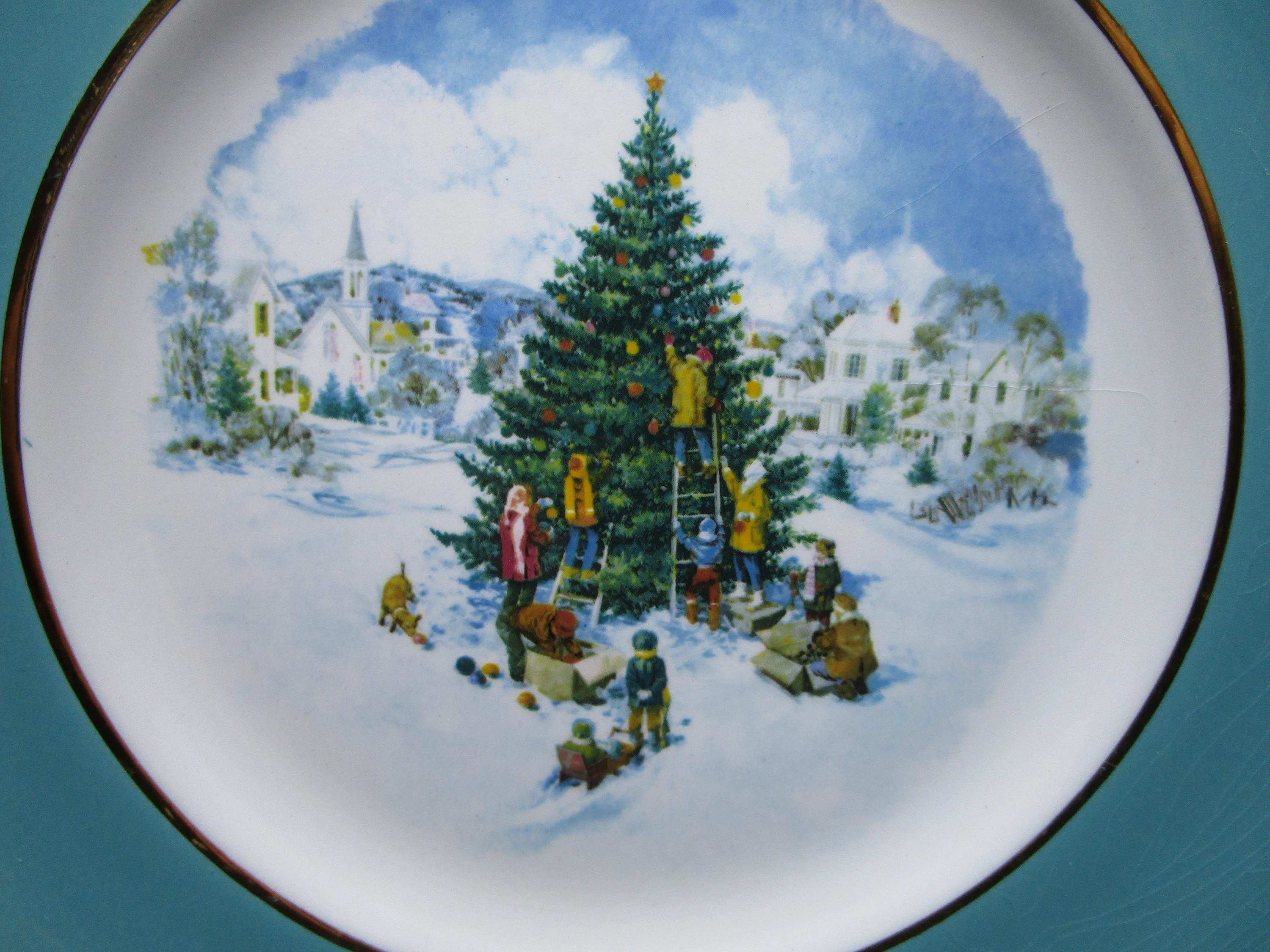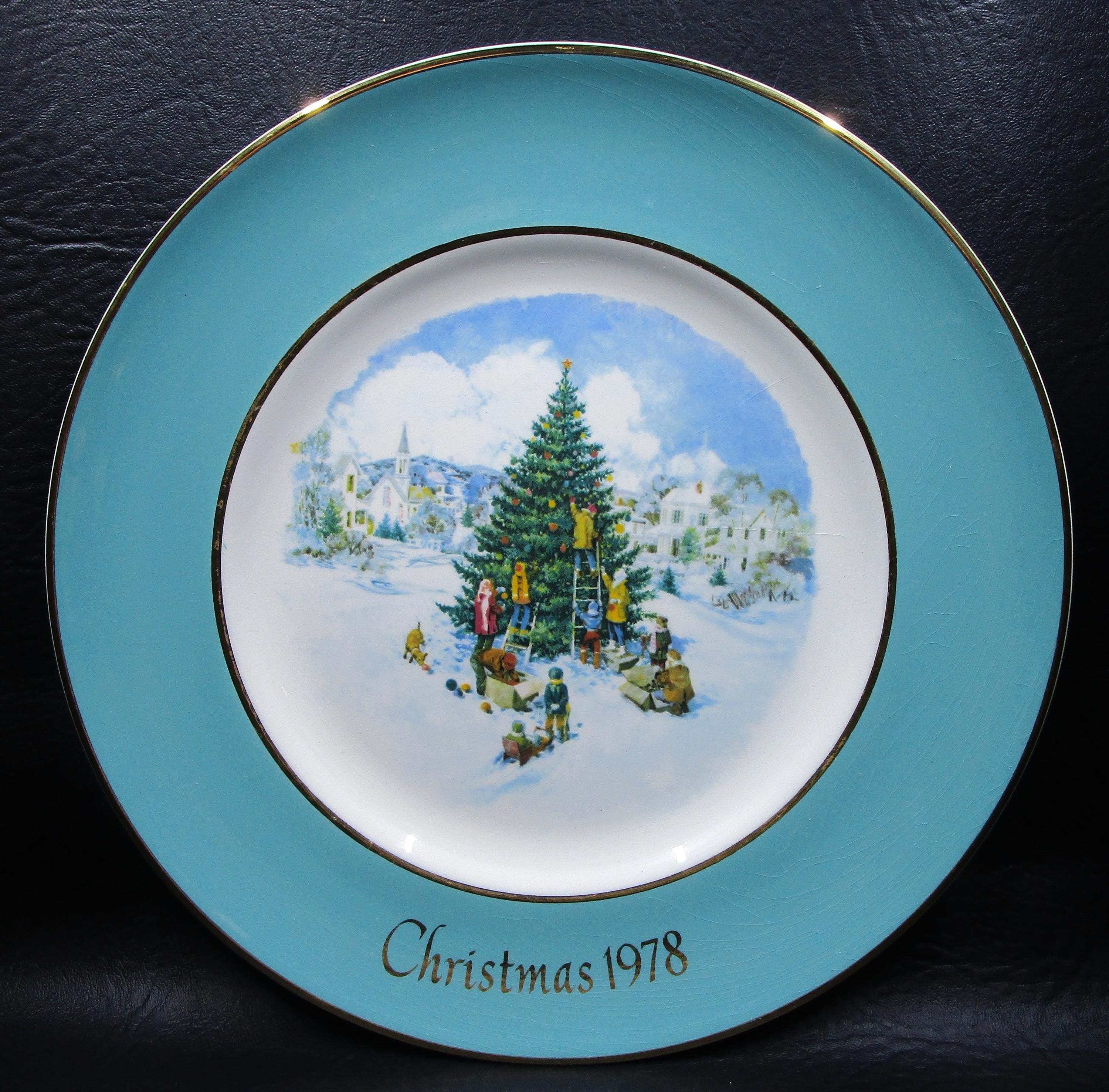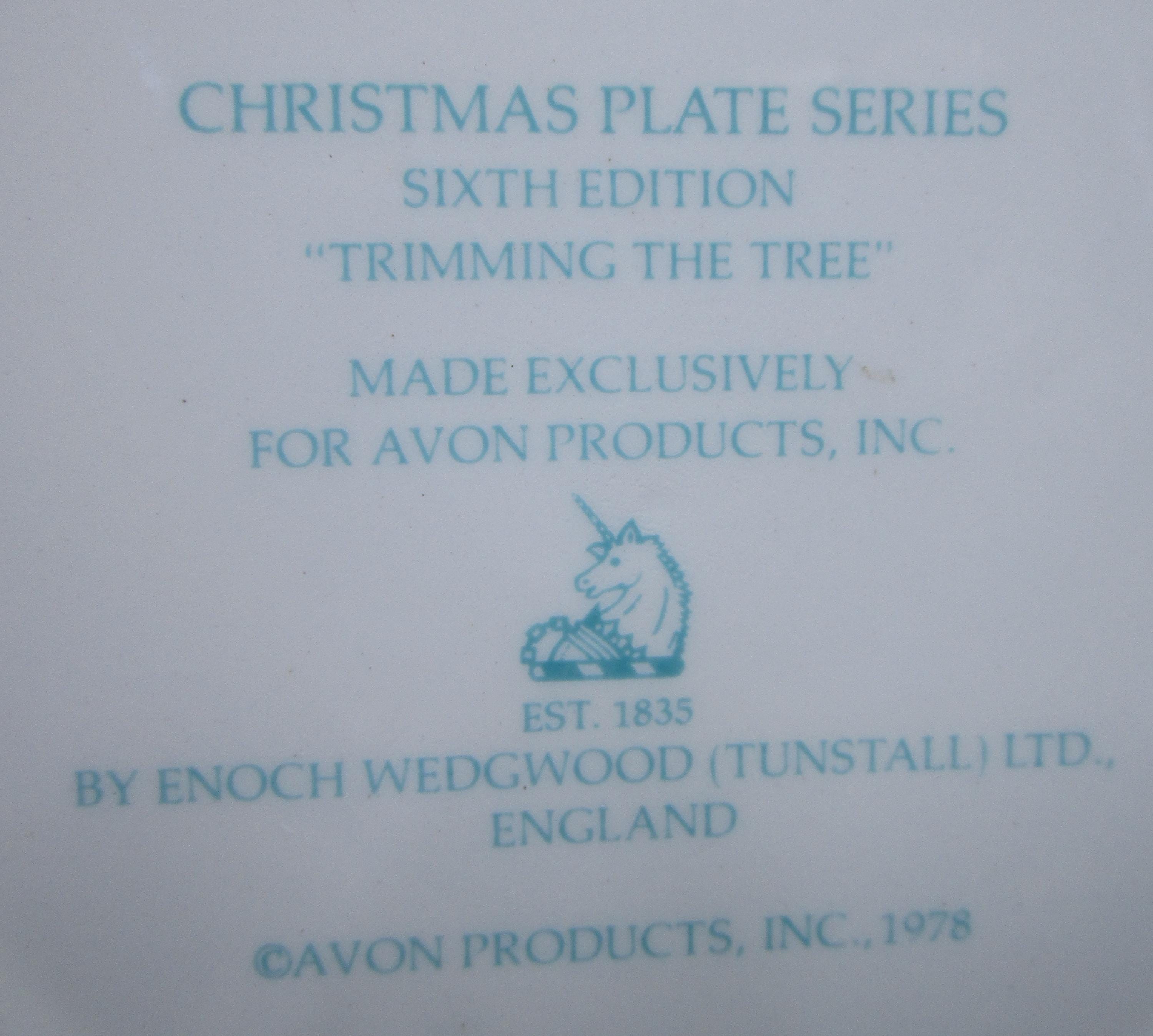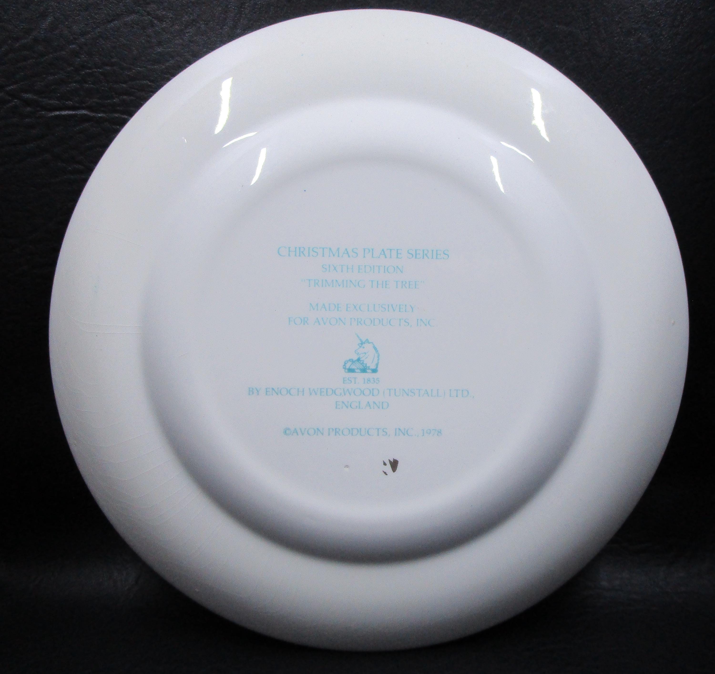 A clean vintage item for collectors, this item is the 1978 edition in the Avon Country Christmas, Christmas Plate Series, from Enoch Wedgwood. Artwork is titled, "Trimming the Tree!" Lovely, quality item, depicting Christmas festivities in the small, country village. Border is a pretty blue-green (aqua), edged with gold.
