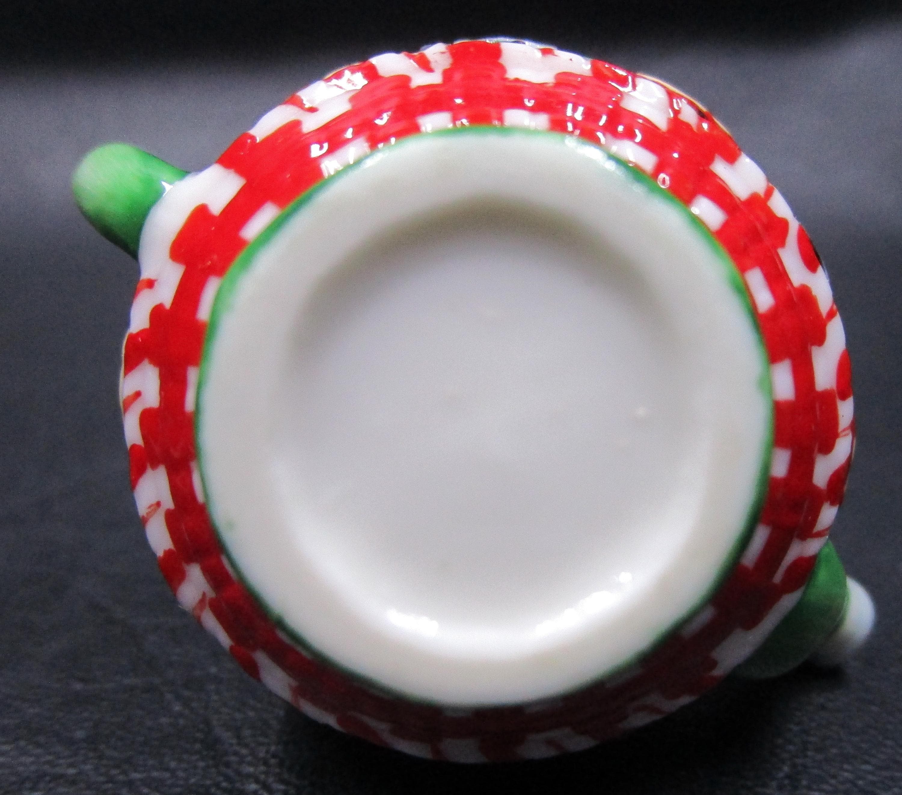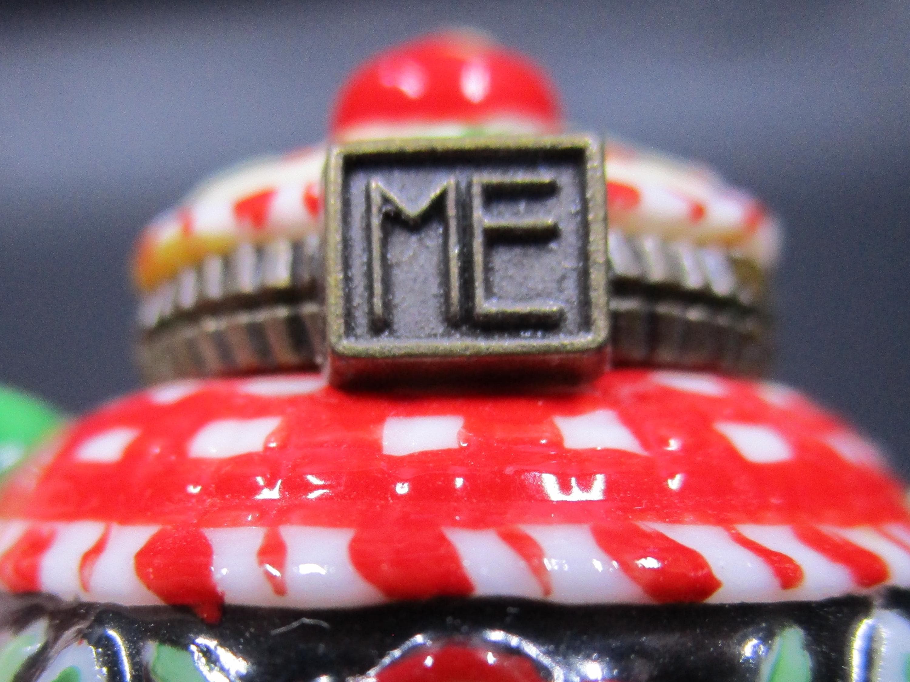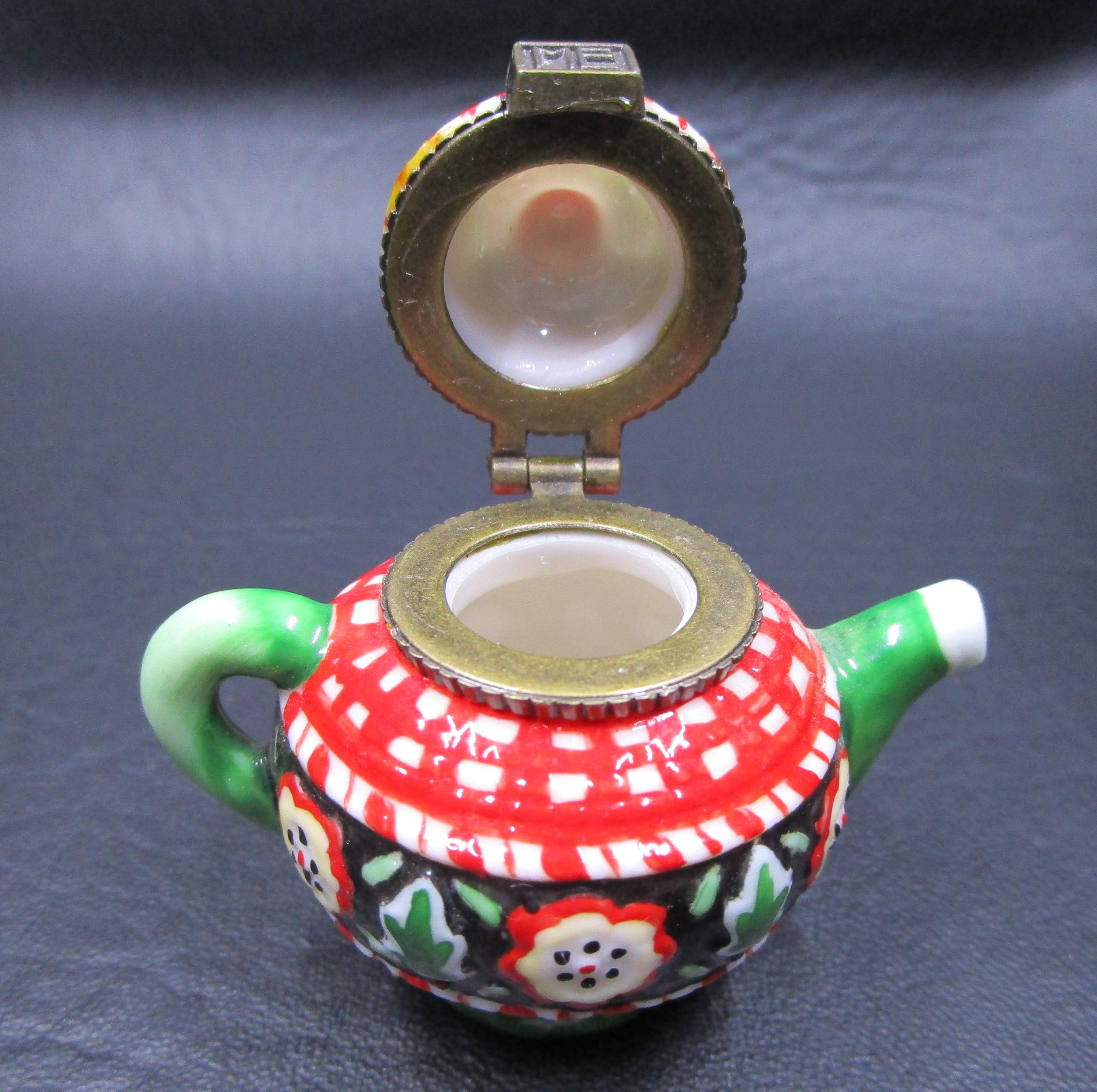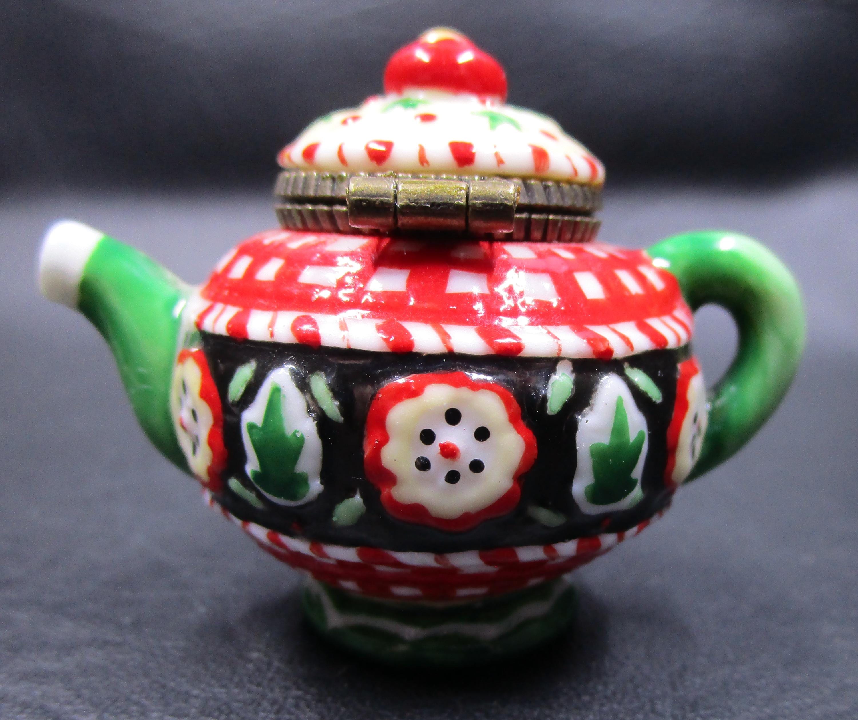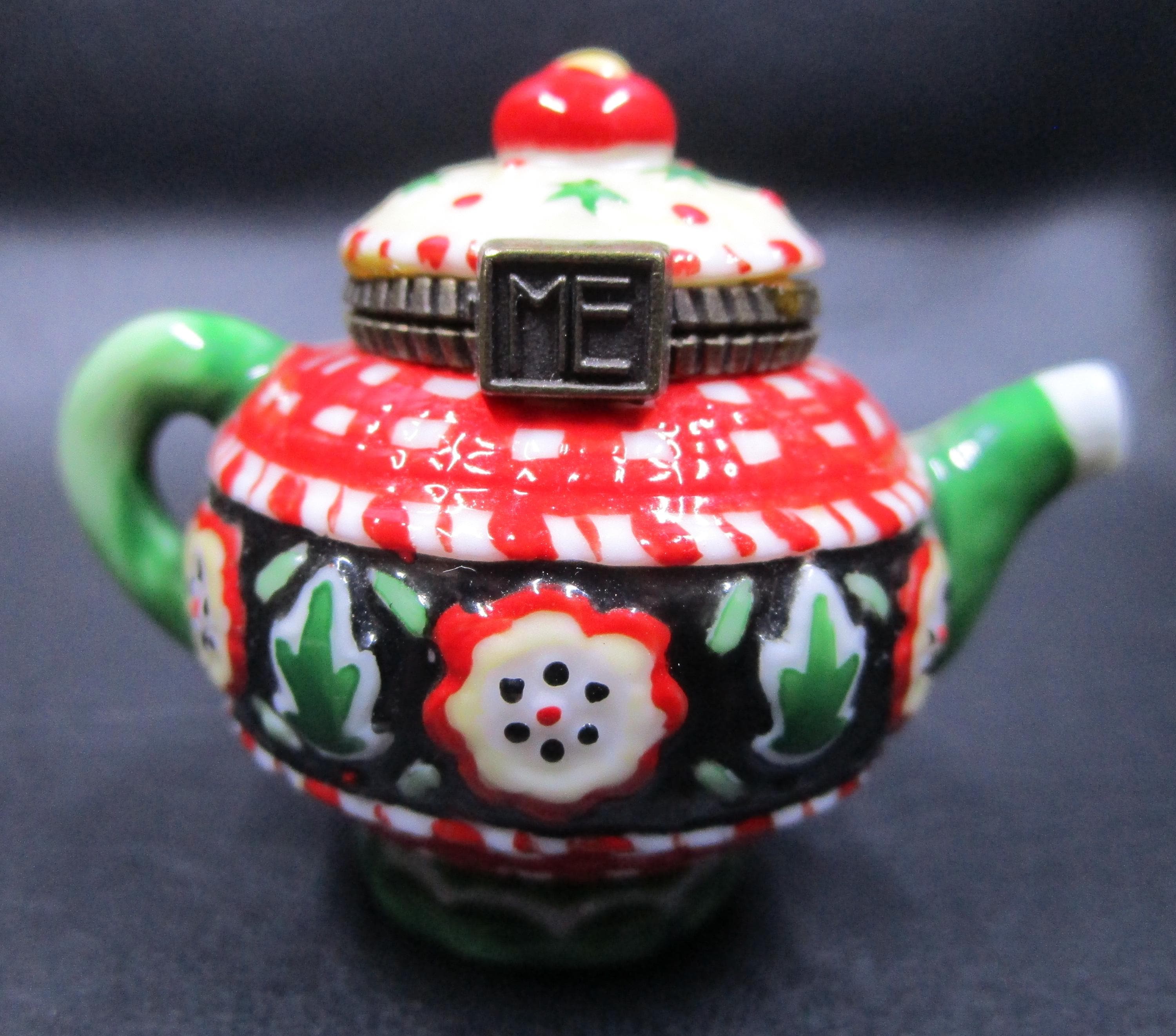 Cute miniature porcelain teapot trinket box with hinged lid from Mary Engelbreit. Traditional German Christmas motif on this Christmas-themed surprise box, using black, red, white and green. ME logo on the box clasp in brass.