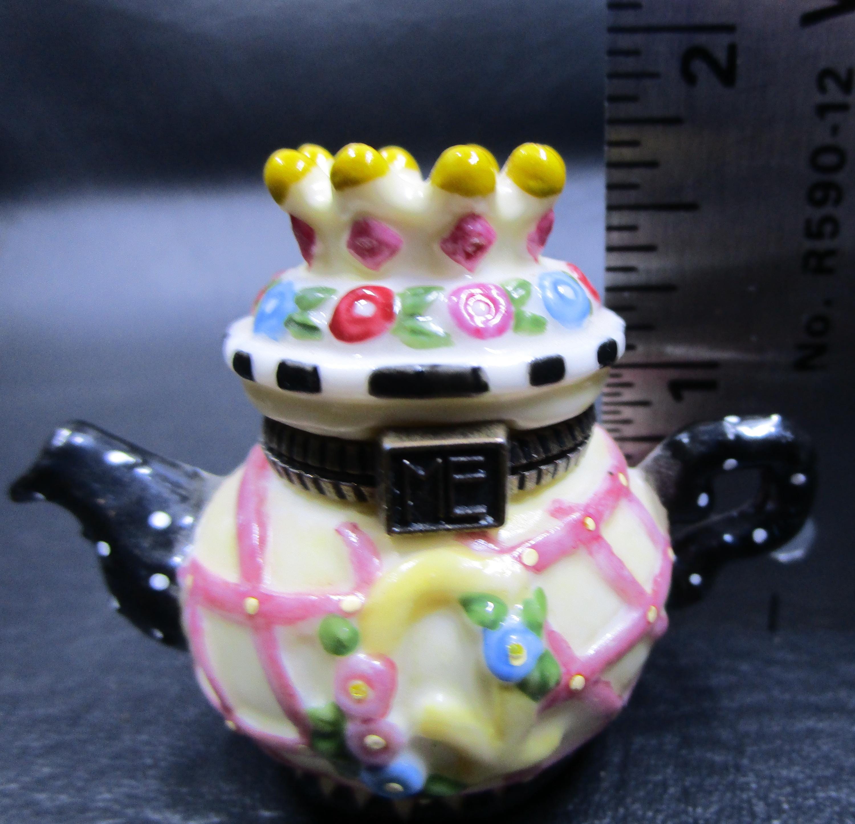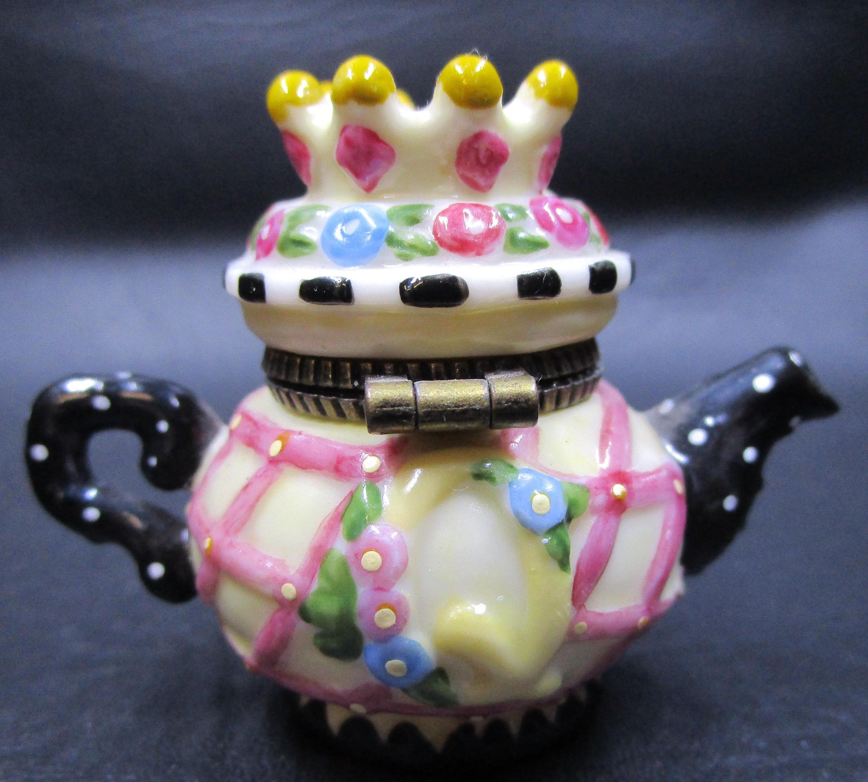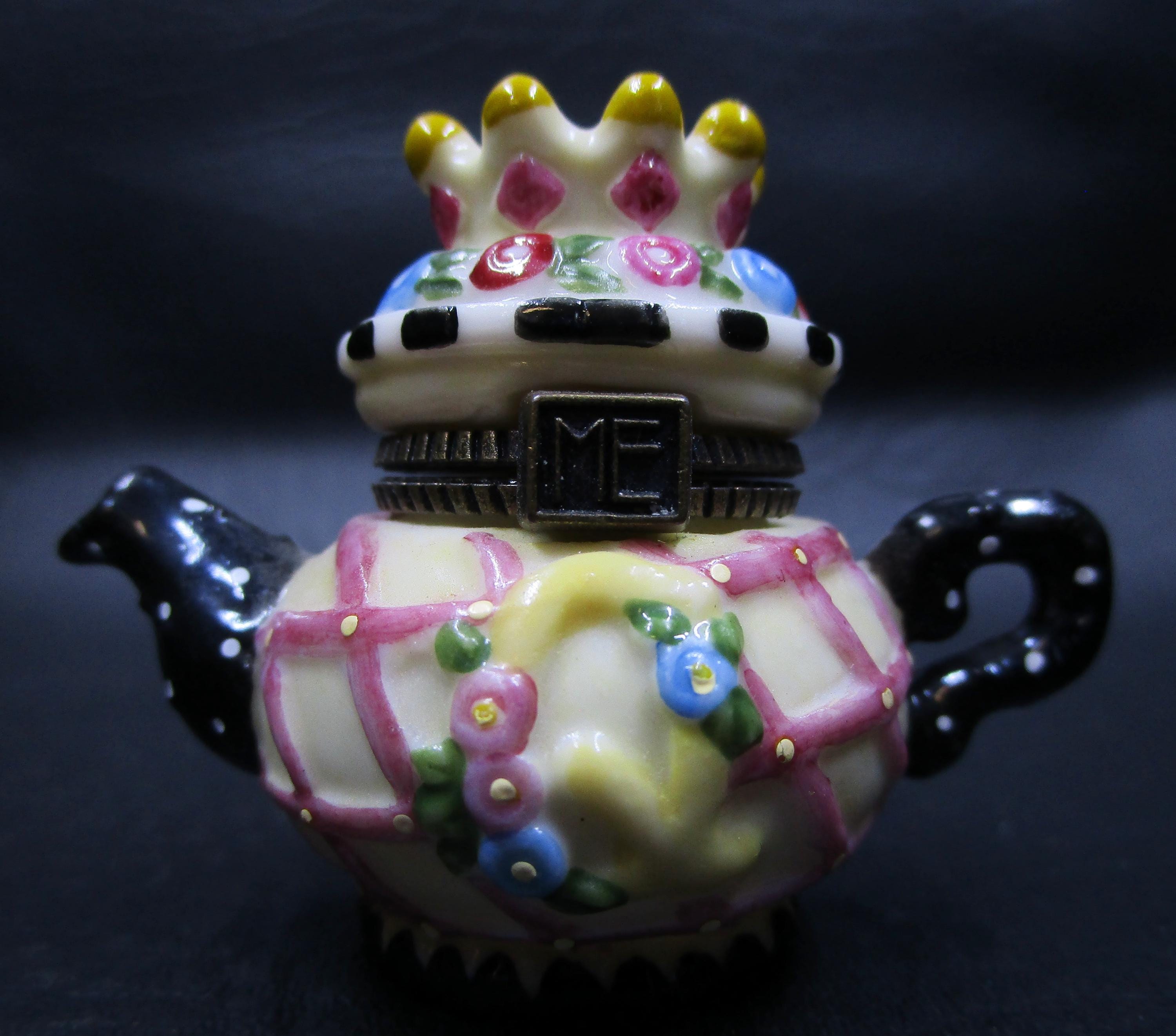 Cute miniature porcelain teapot trinket box with hinged lid from Mary Engelbreit. Q for Queen, and a tiara on this surprise box, using yellow, pink, black and white. ME logo on the box clasp in brass.