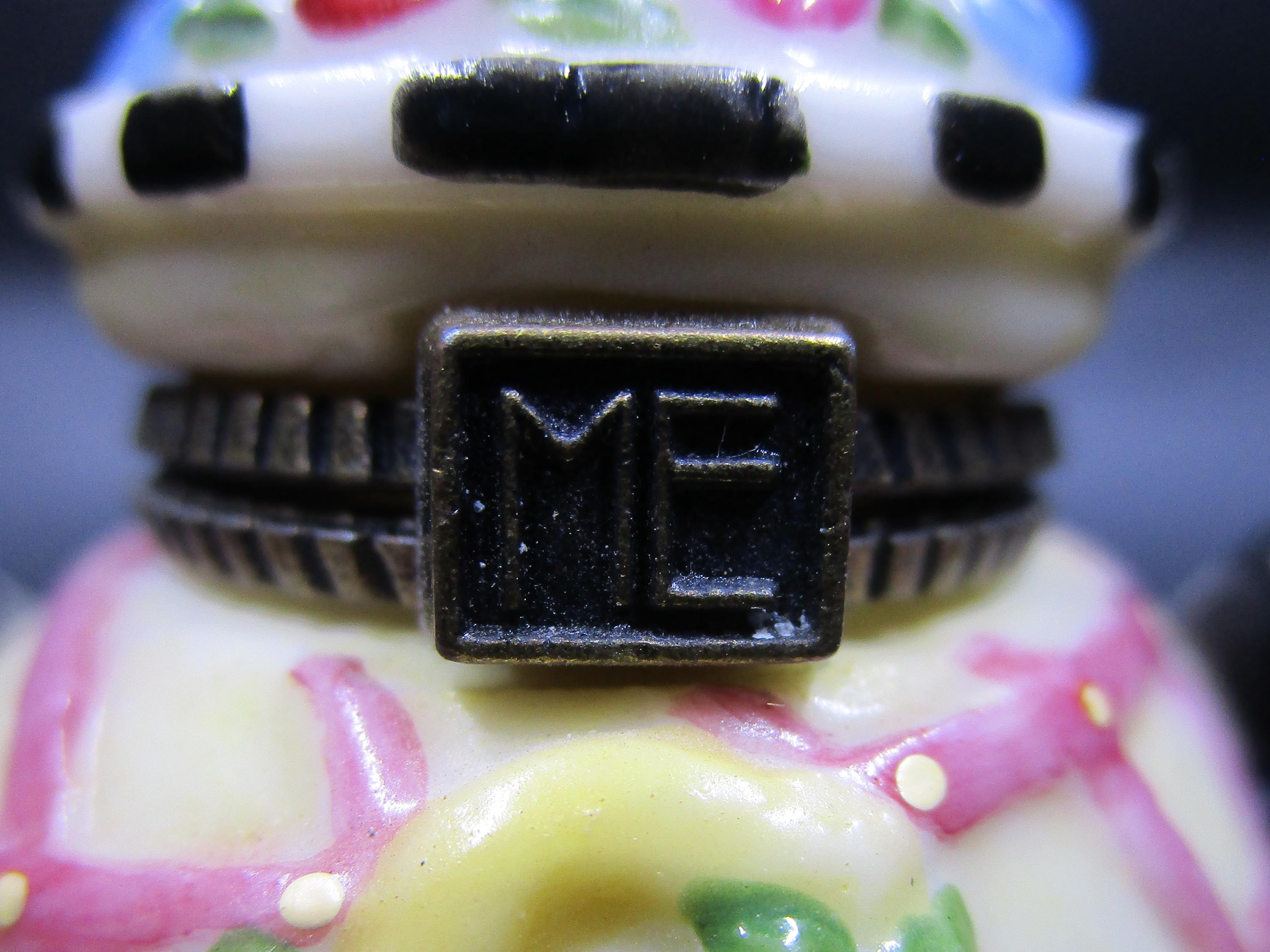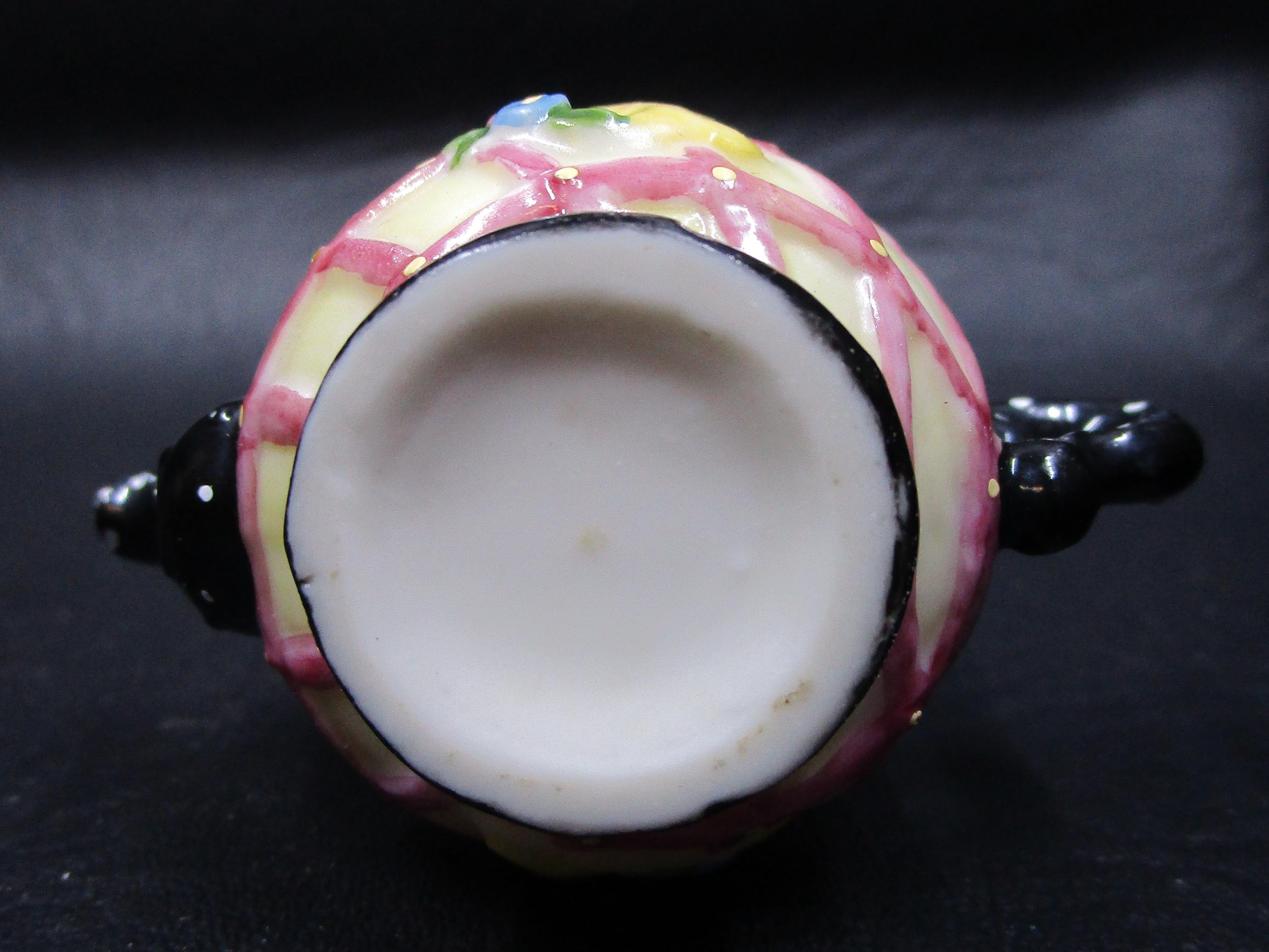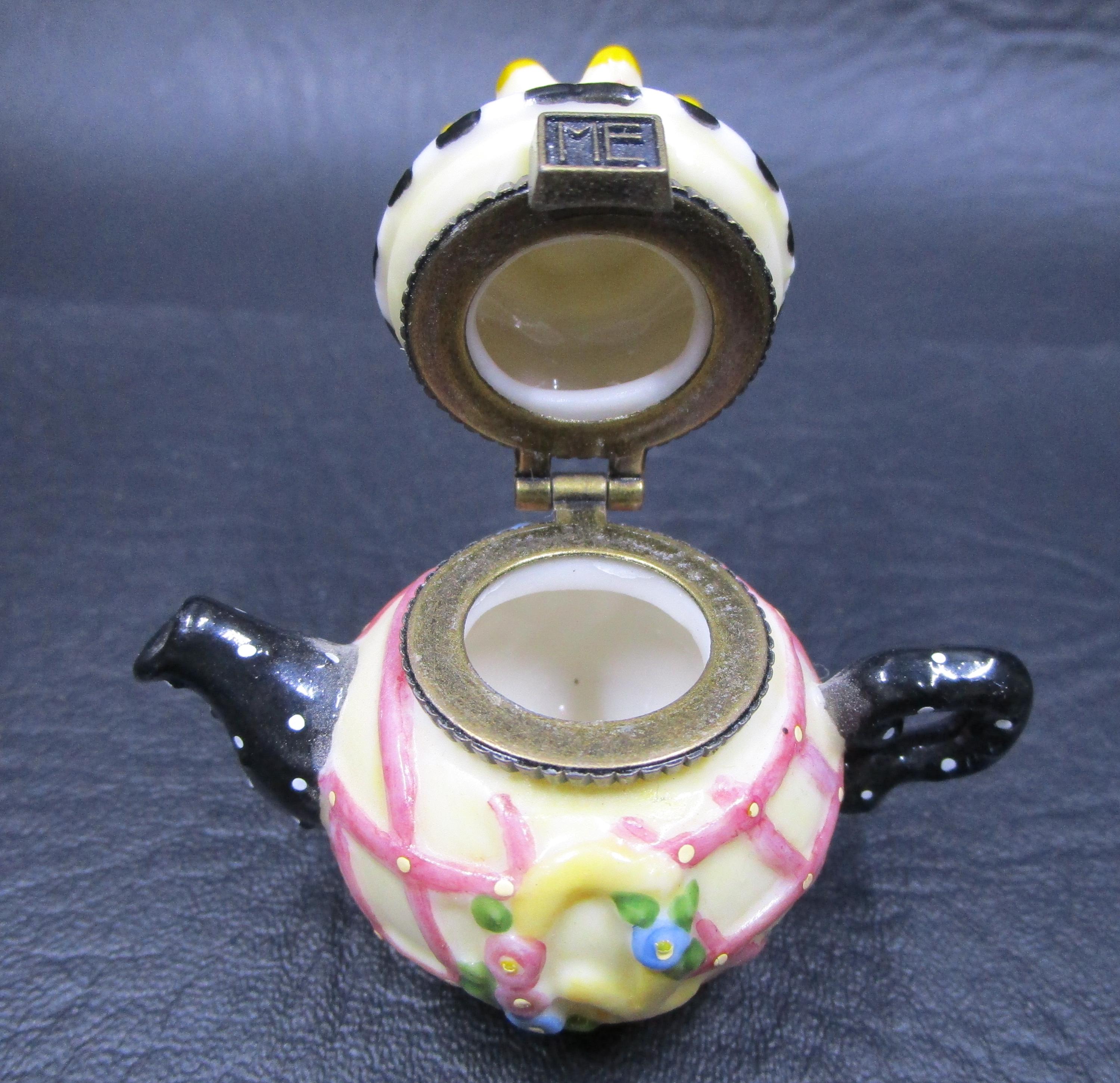 Cute miniature porcelain teapot trinket box with hinged lid from Mary Engelbreit. Q for Queen, and a tiara on this surprise box, using yellow, pink, black and white. ME logo on the box clasp in brass.