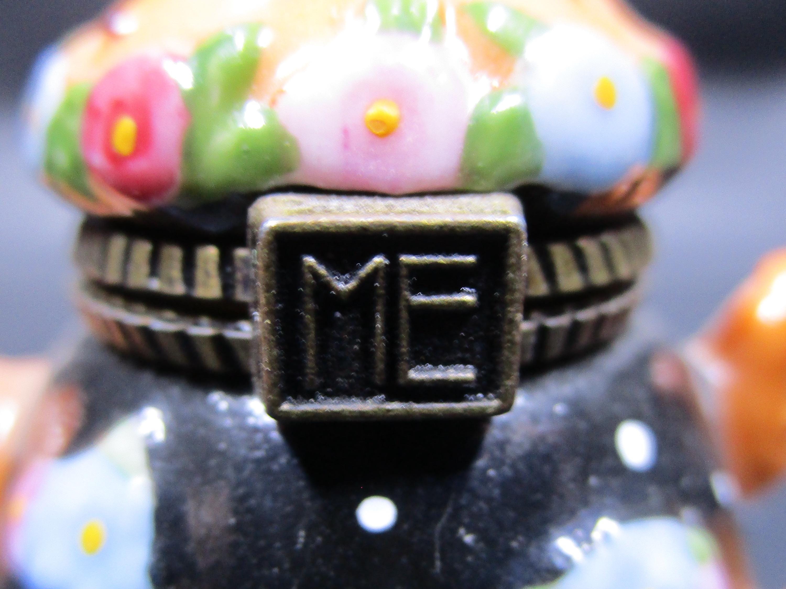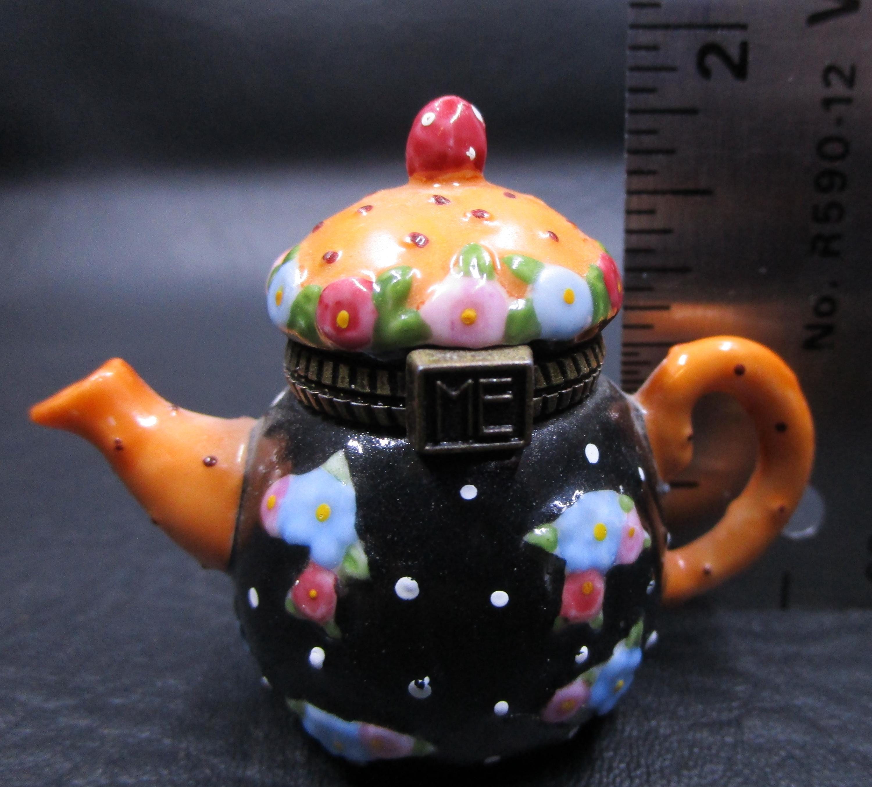 Cute miniature porcelain teapot trinket box with hinged lid from Mary Engelbreit. Stylized flowers and dots adorn this black and orange teapot. ME logo on the box clasp in brass.