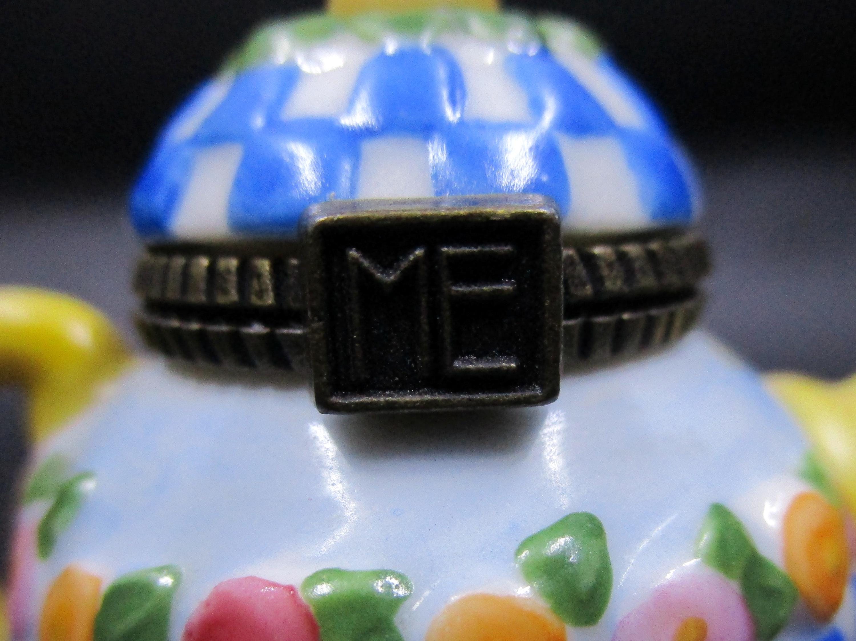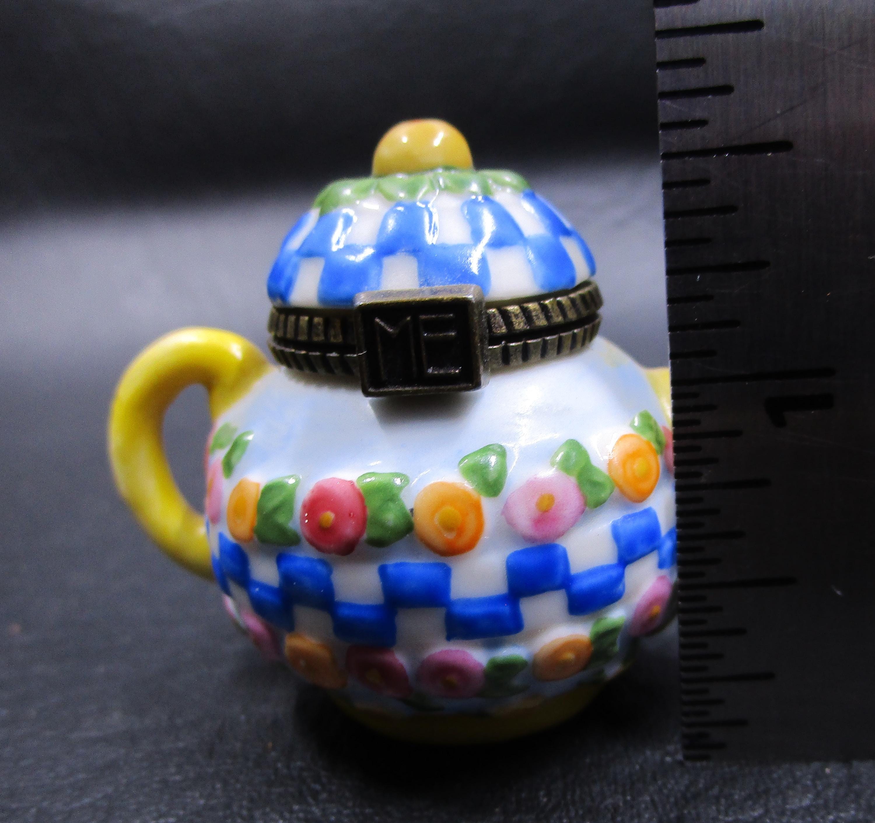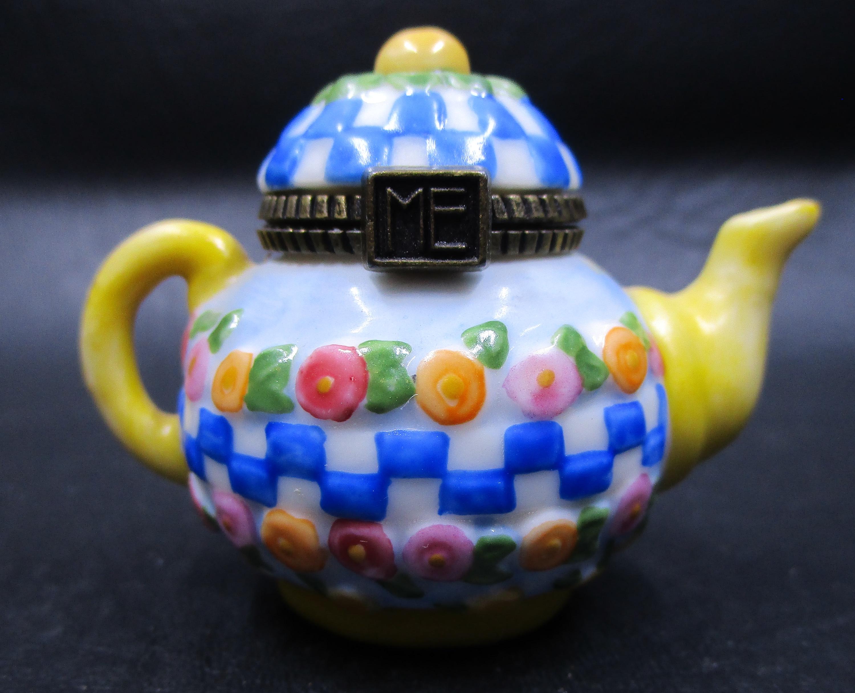 Cute miniature porcelain teapot trinket box with hinged lid from Mary Engelbreit. Cluster of flowers and blue/white checkerboard pattern adorn this spring-inspired teapot. Artist used blue, pink, green, yellow to decorate this teapot. ME logo on the box clasp in brass.