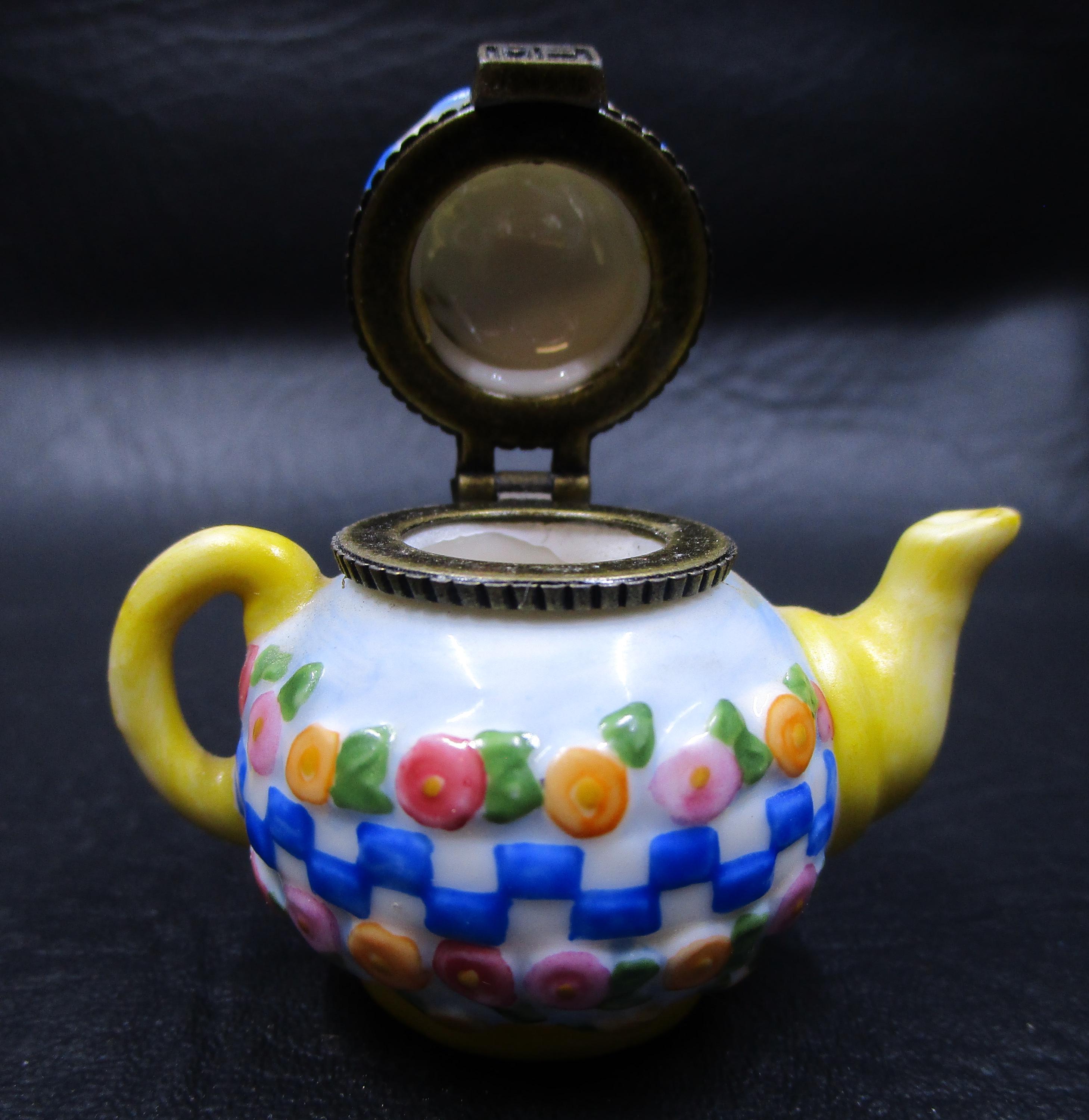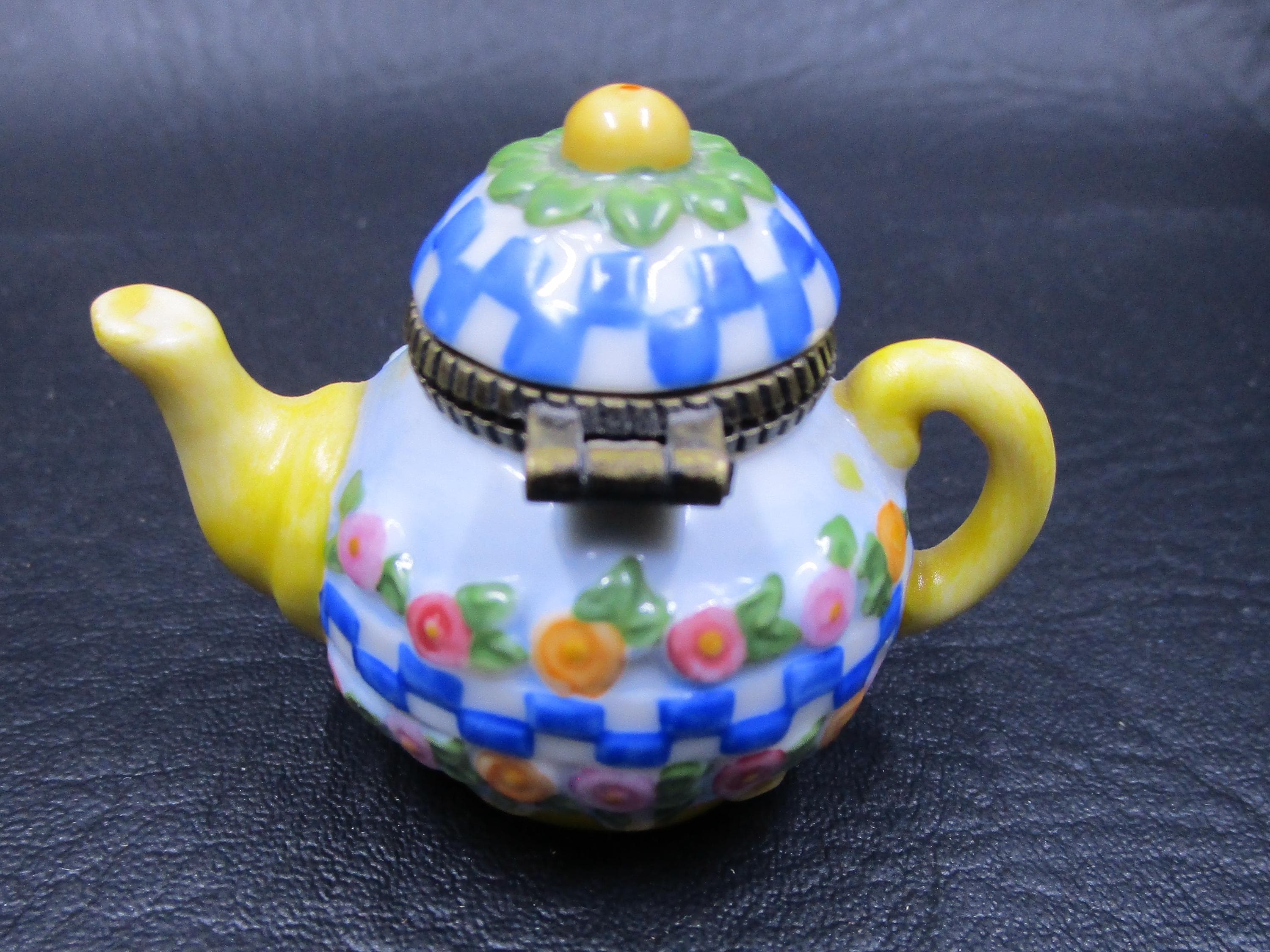 Mary Engelbreit Trinket Box Miniature Tea Pot Shape Spring Flowers Blue Checkerboard 1998