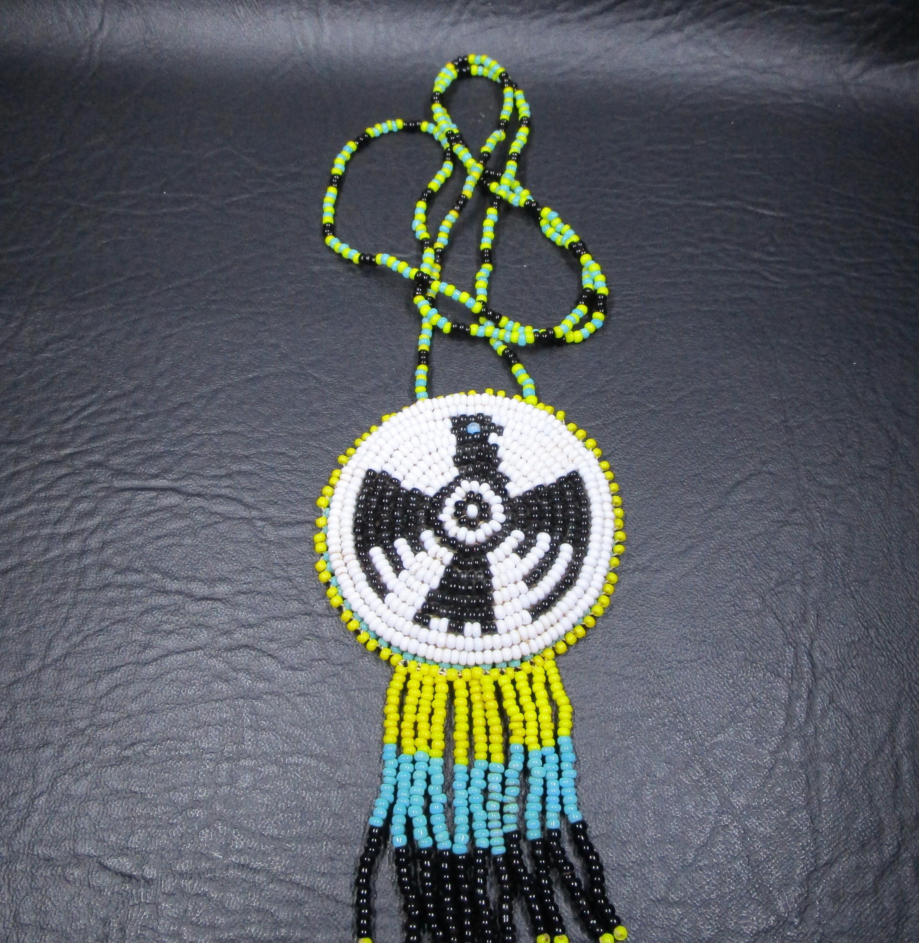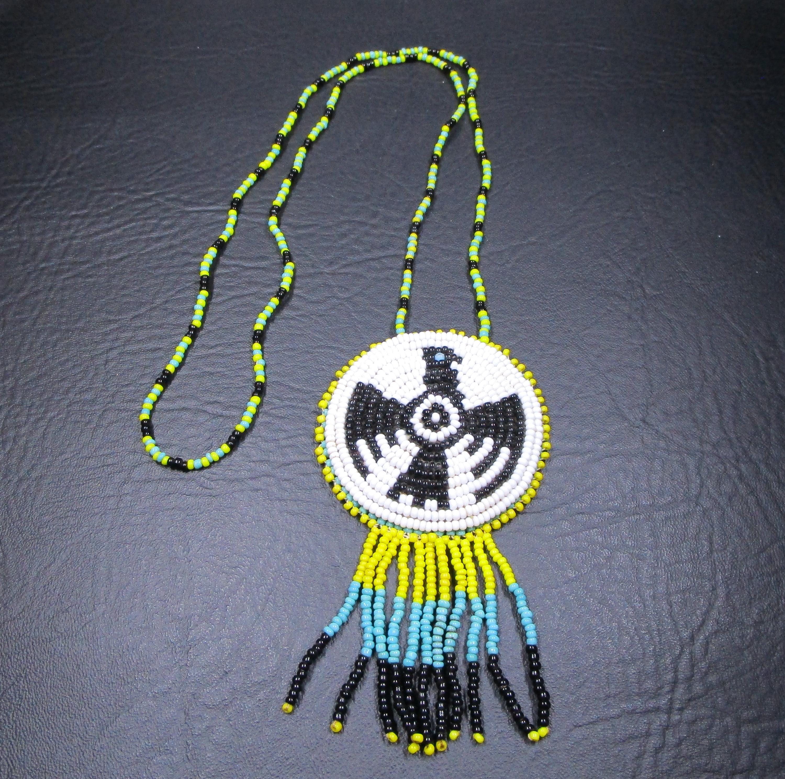 This Native American Thunderbird Medallion necklace is crafted from seed beads. The central motif of the thunderbird is significant in many Indigenous cultures across North America.