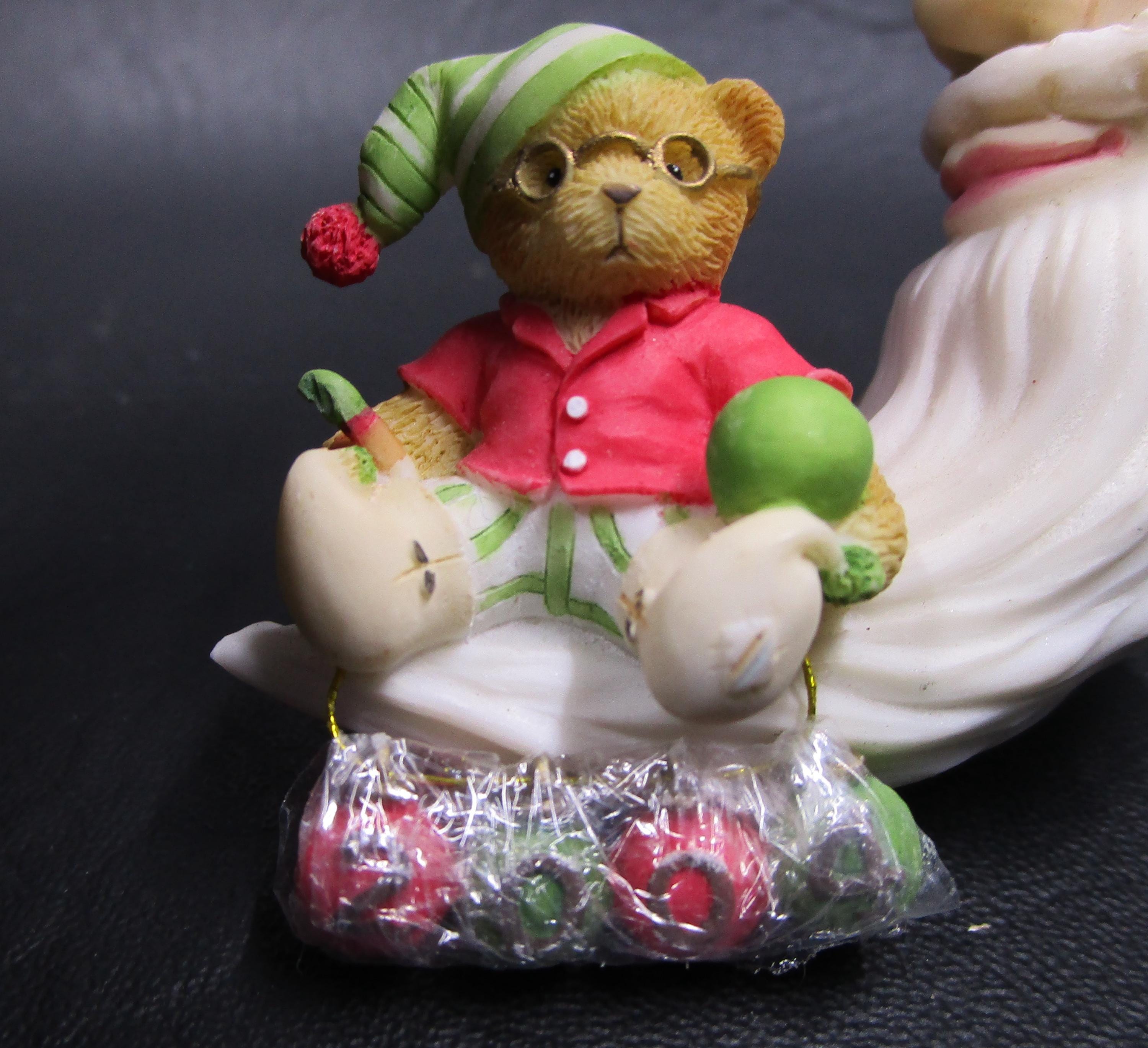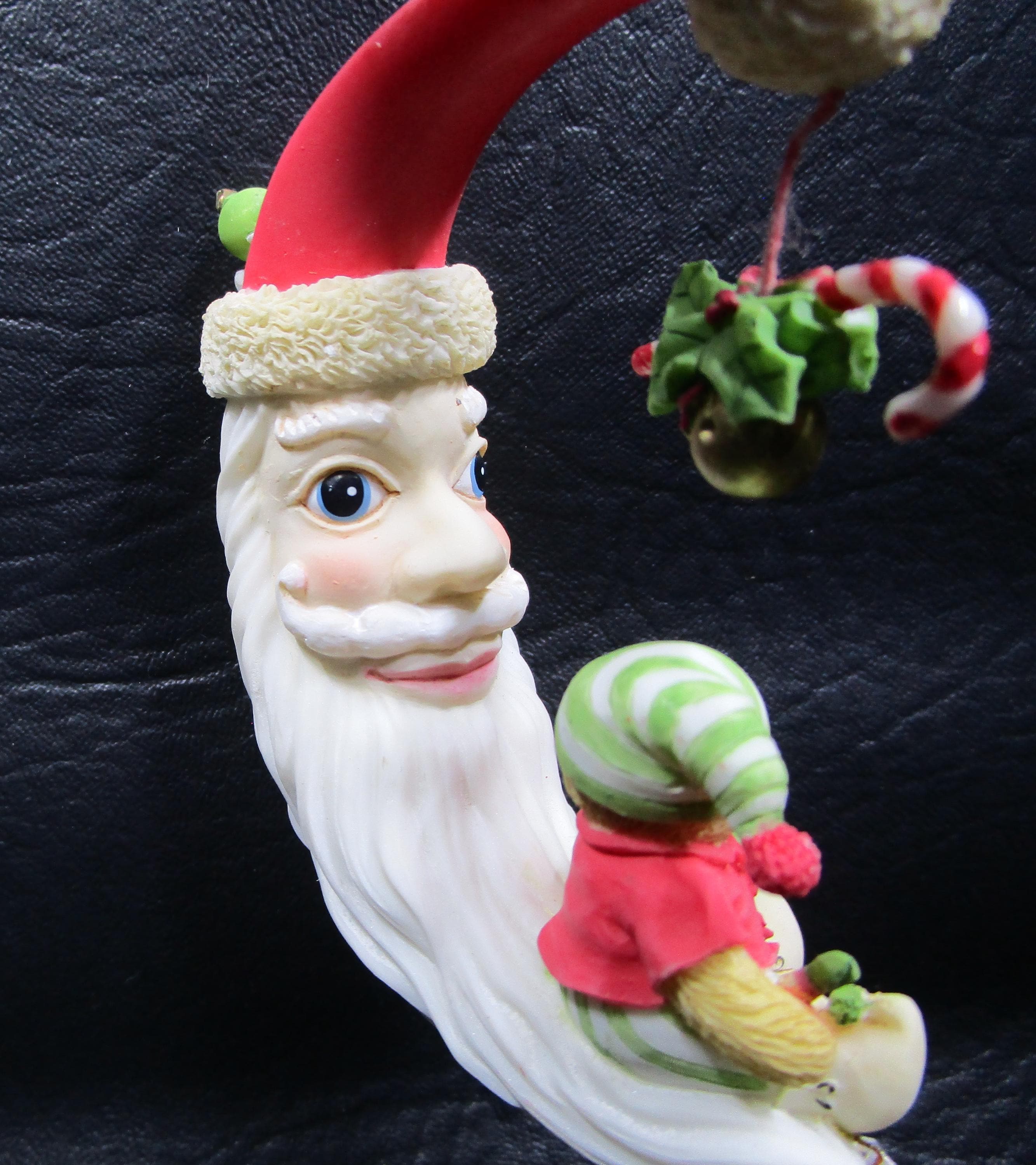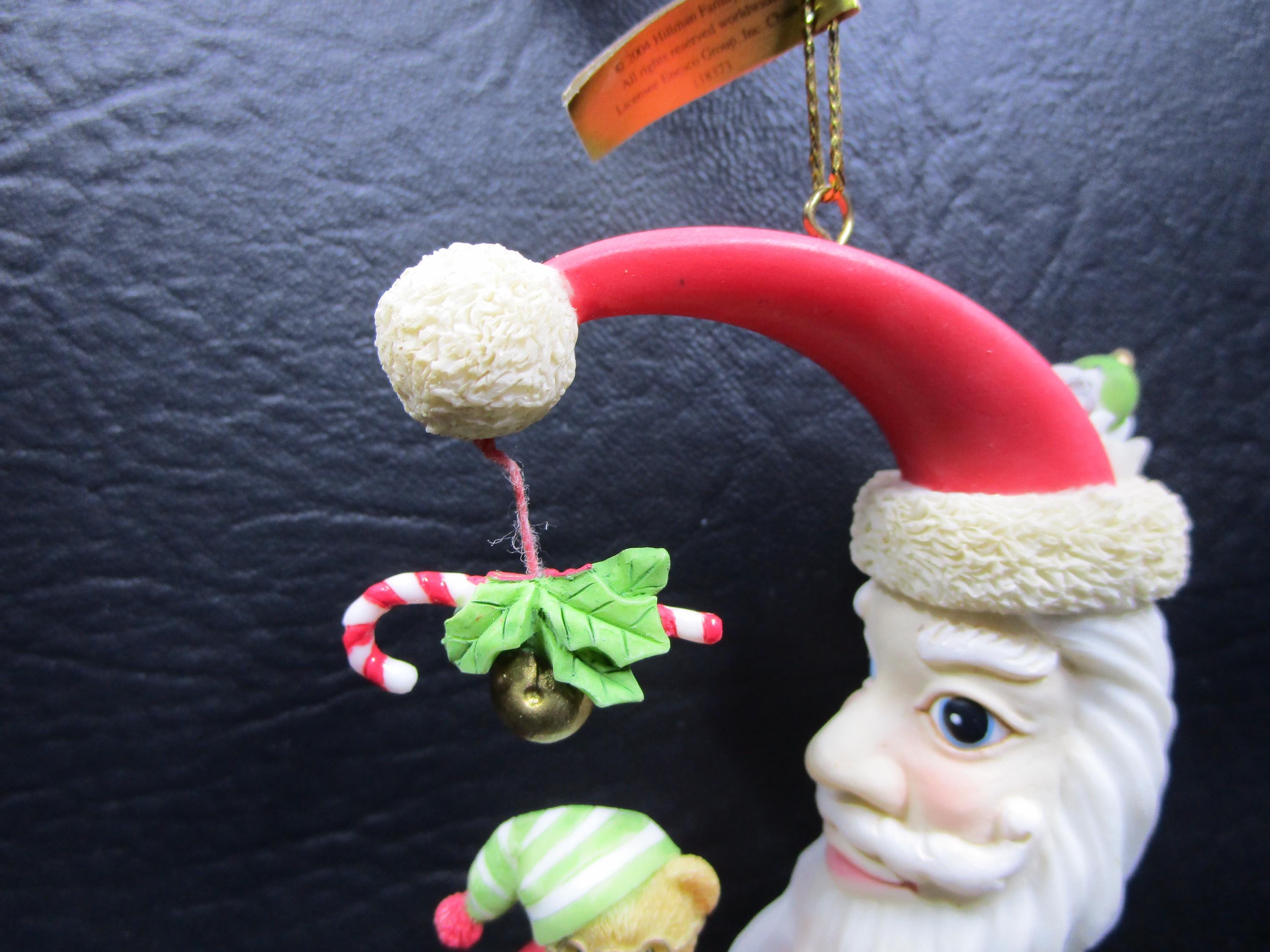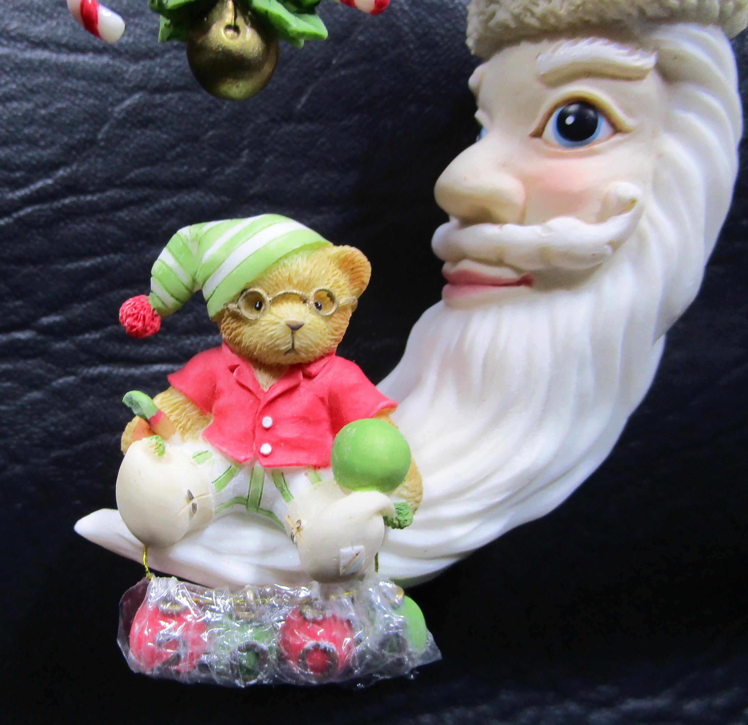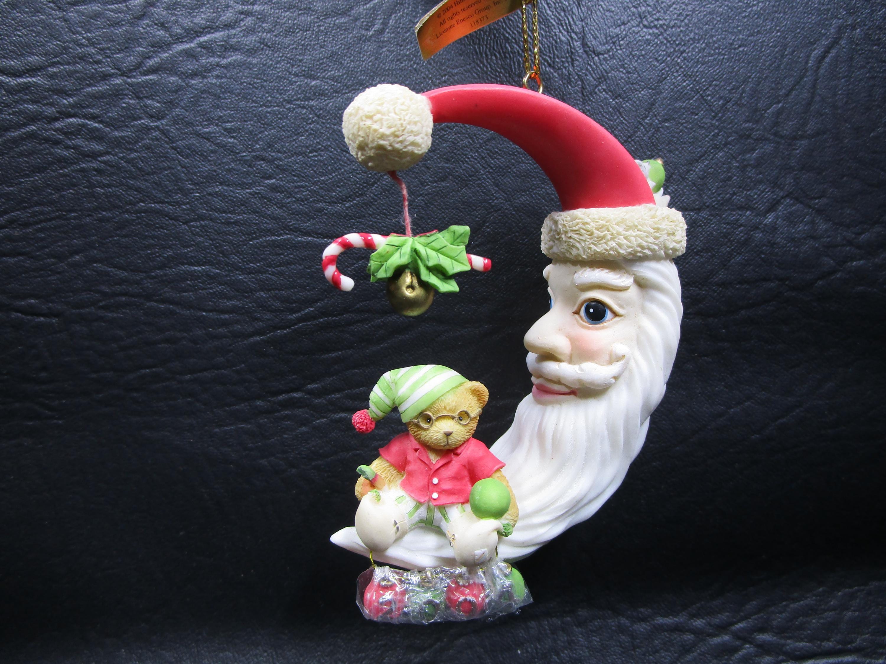 Artist Priscilla Hillman creates another ornament for Enesco's Cherished Teddies line, with this beautifully detailed porcelain hanging ornament. The Man in Crescent Moon has gotten into the Christmas Spirit with his hat, long beard. An adorable little bear is enjoying sitting on Santa's beard! Ornament was created for the 2004 Season.