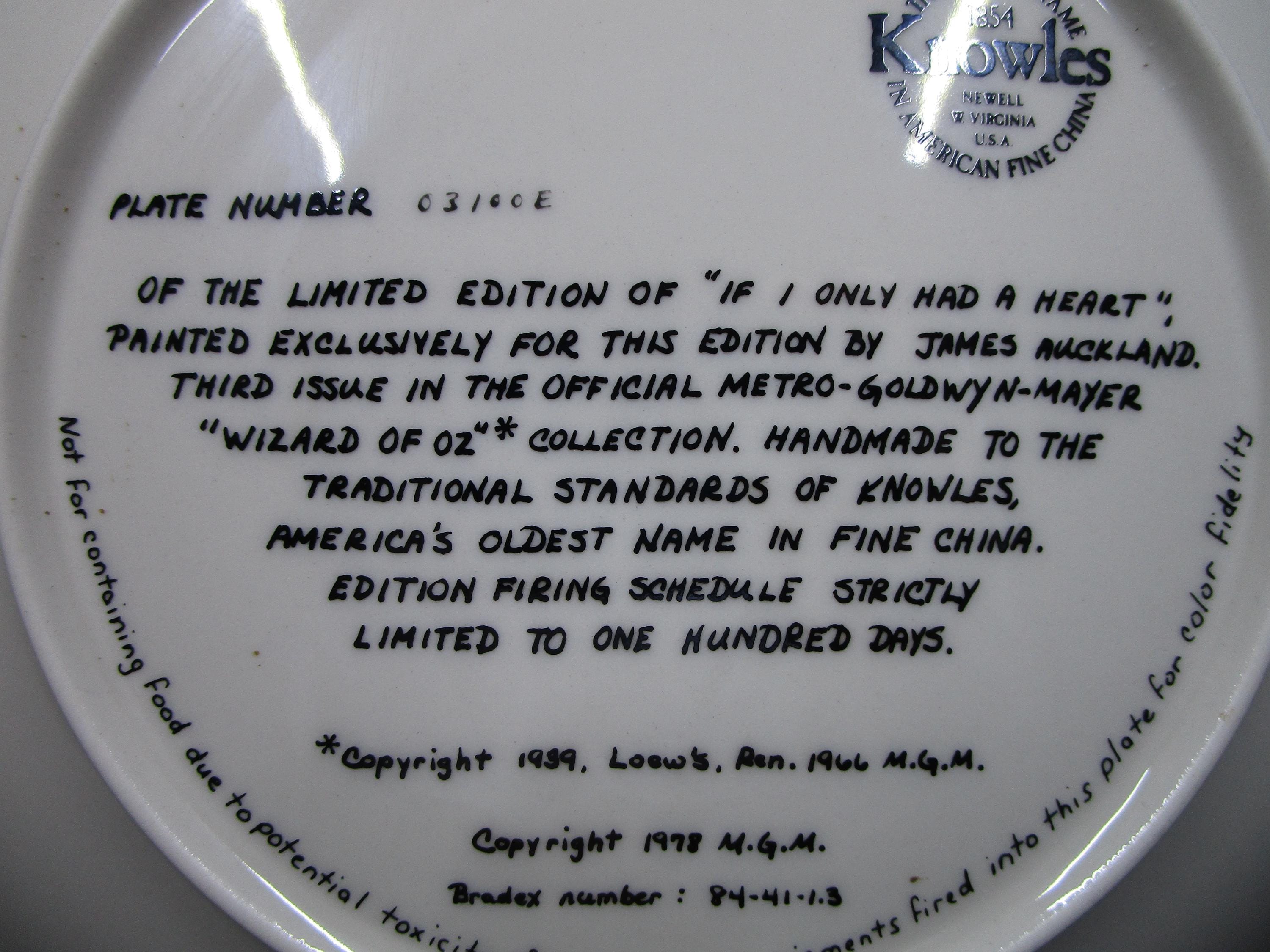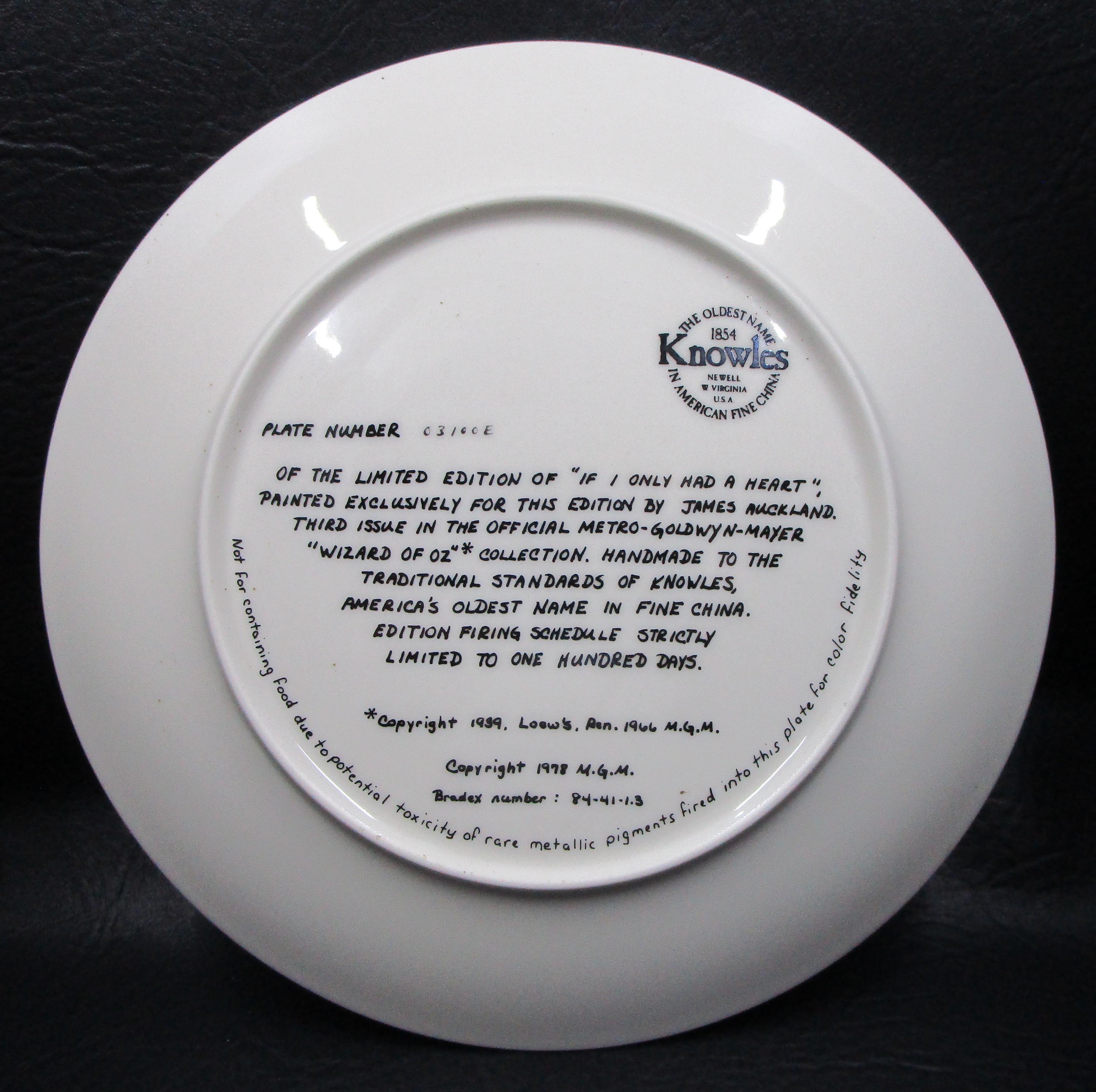 "If I Only Had A Heart," is the third issue plate in the Wizard of Oz collection, from the Edwin M. Knowles China Company. The plate, designed by portraitist James Auckland, is part of a series inspired by this beloved contemporary classic film to be reviewed and approved by M.G.M. (Metro-Goldwyn-Mayer) NOTE: NO COA, brochure, or original box is available for this item.